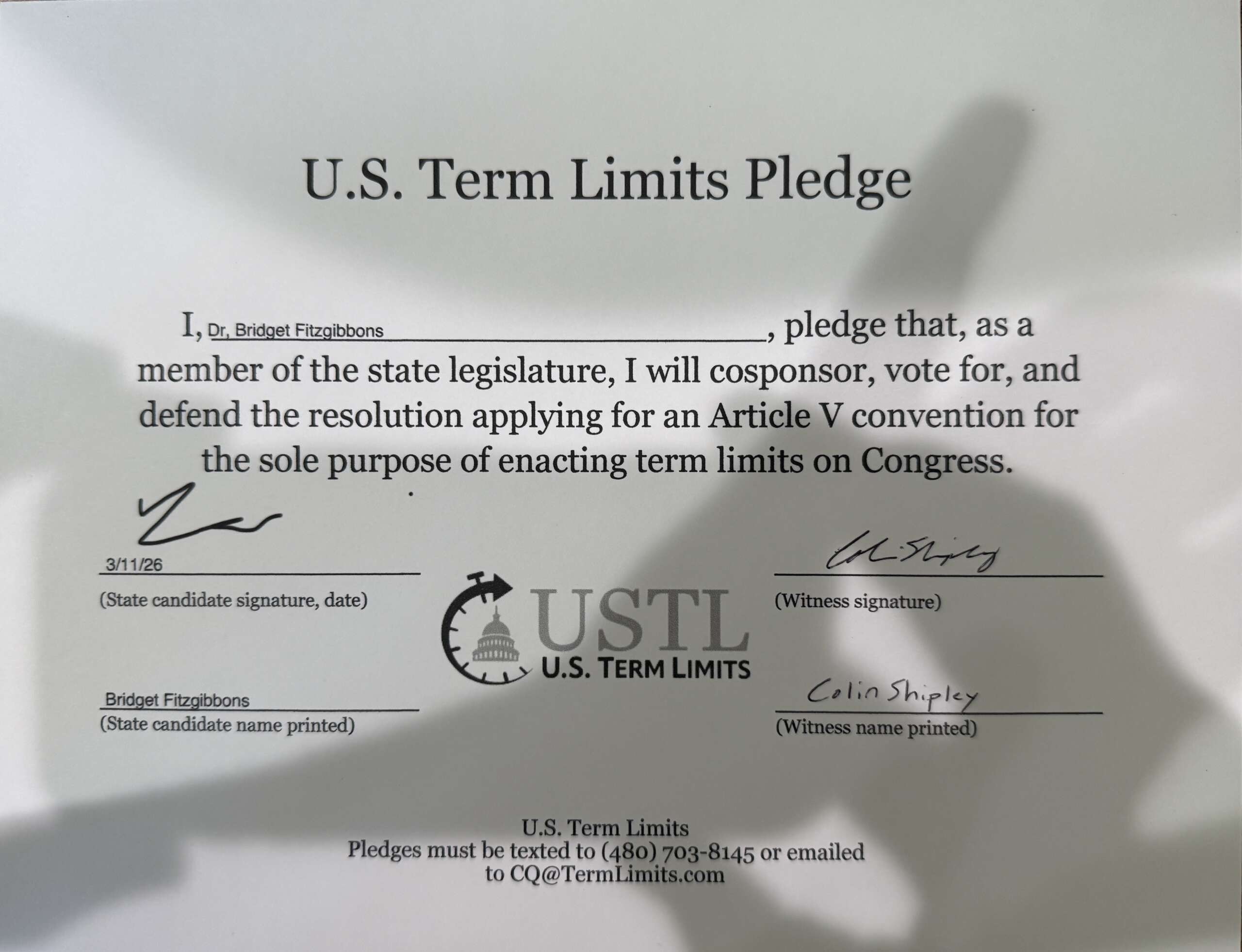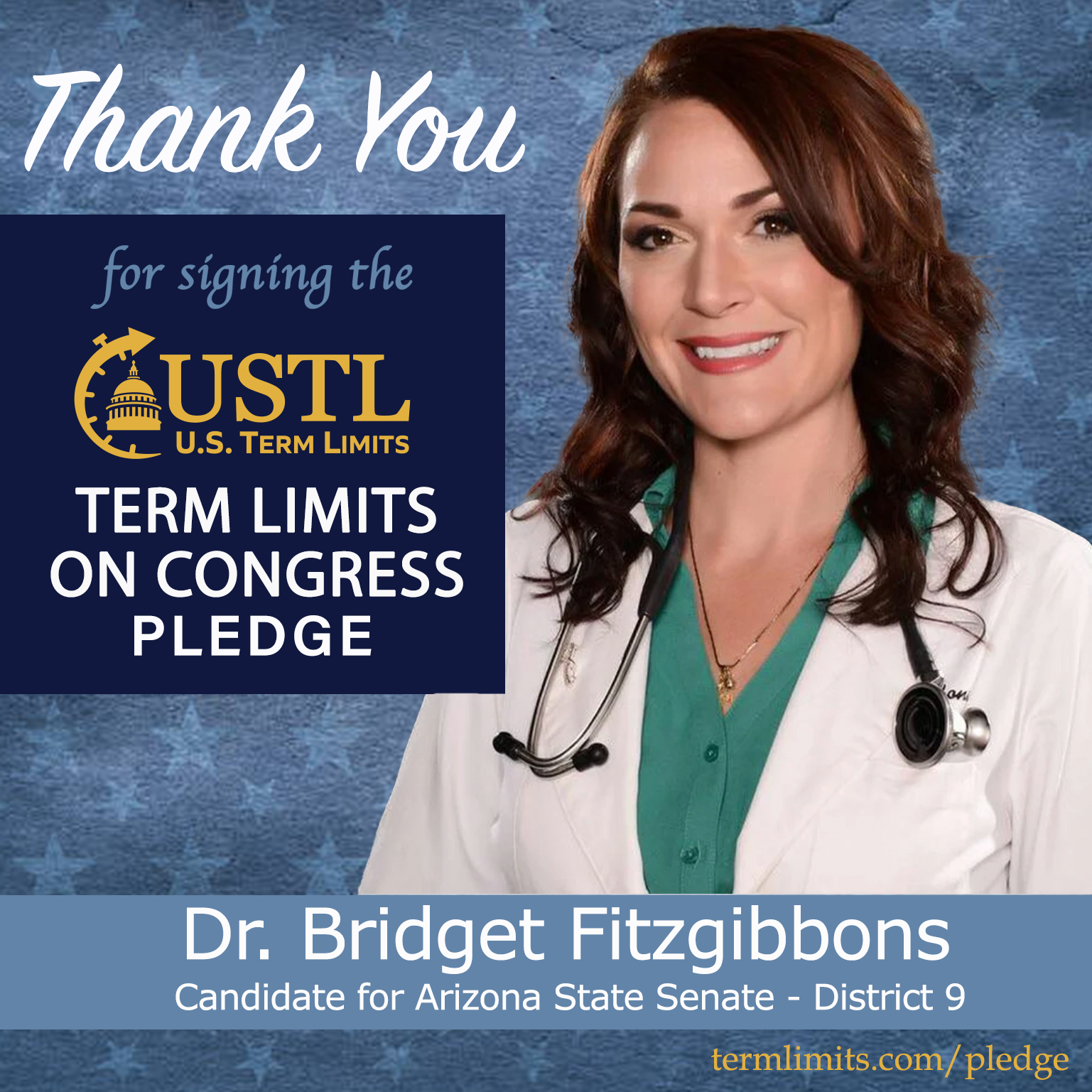 Mesa, AZ – U.S. Term Limits (USTL), the leader in the national, non-partisan movement to limit terms for elected officials, is gathering support from state lawmakers across the nation. Its mission is to get 34 states to apply for an amendment proposal convention specific to term limits on Congress. 2026 Arizona state senate candidate, Dr. Bridget Fitzgibbons (district 9), has committed support for term limits on Congress by signing the term limits convention pledge.