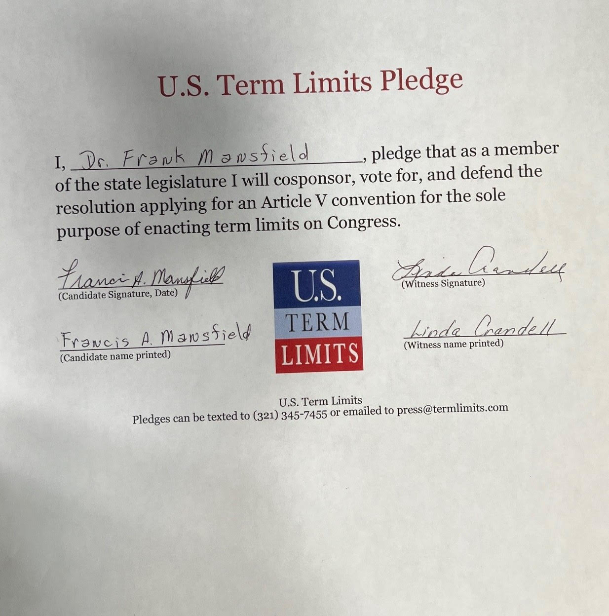 Dr. Frank Mansfield Pledges to Support Congressional Term Limits