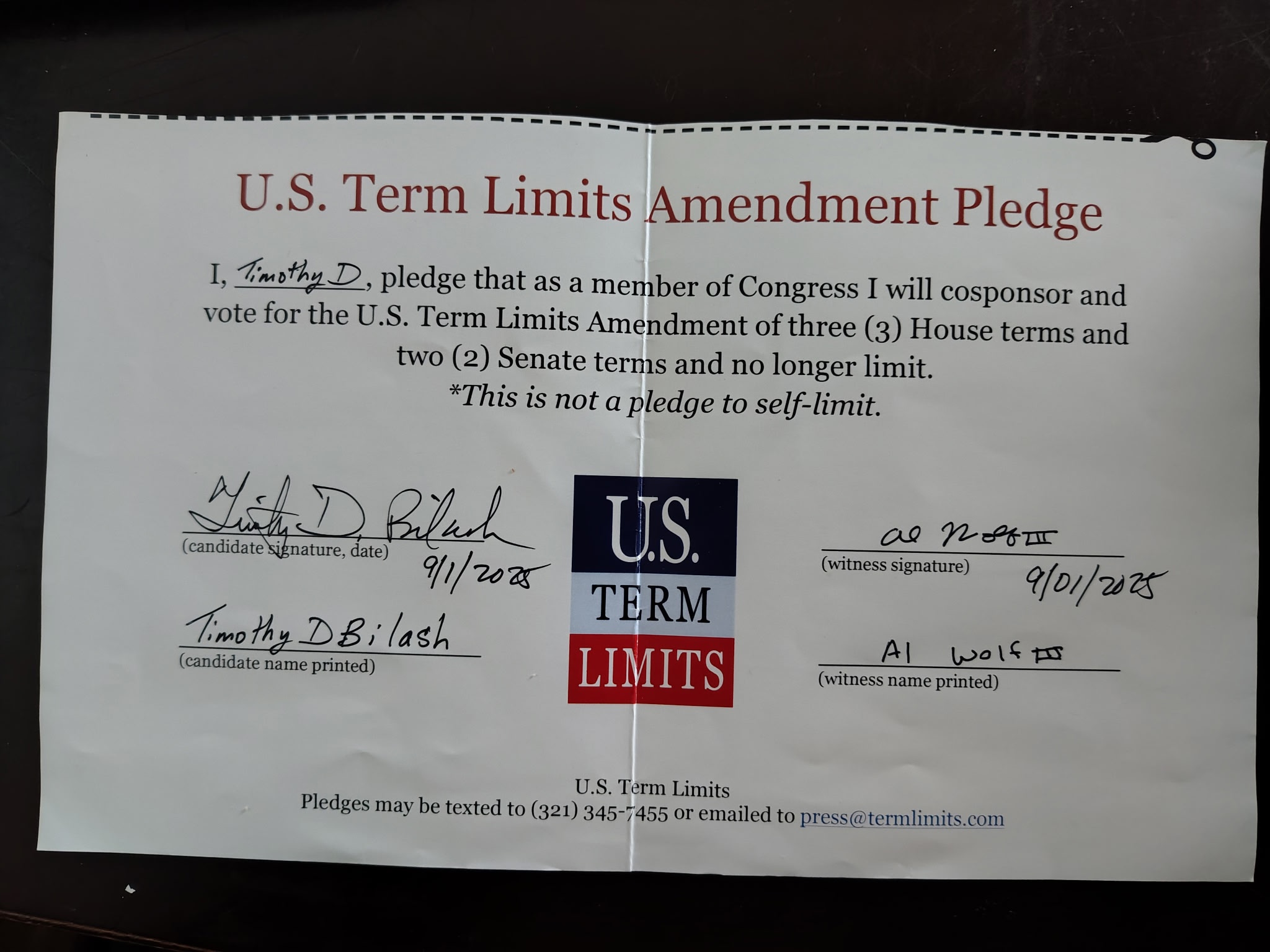 Dr. Tim Bilash Pledges to Support Congressional Term Limits