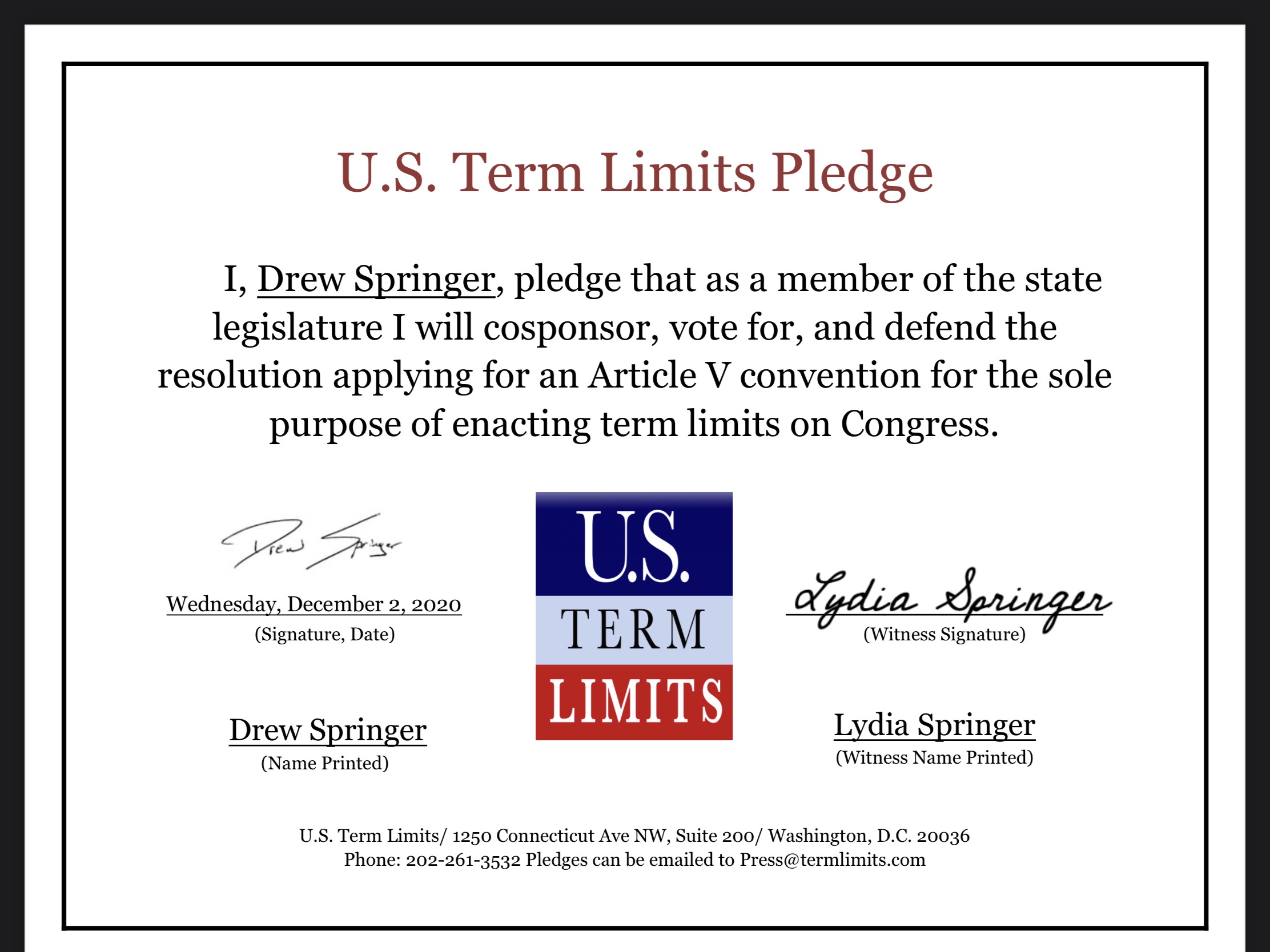 Austin, TX – U.S. Term Limits (USTL), the leader in the national, non-partisan movement to limit terms for elected officials, is gathering support from state lawmakers across the nation. Its mission is to get 34 states to apply for an amendment proposal convention specific to term limits on Congress. Texas state senate candidate, Drew Springer (district 30), has committed support for term limits on Congress by signing the Term Limits Convention pledge.