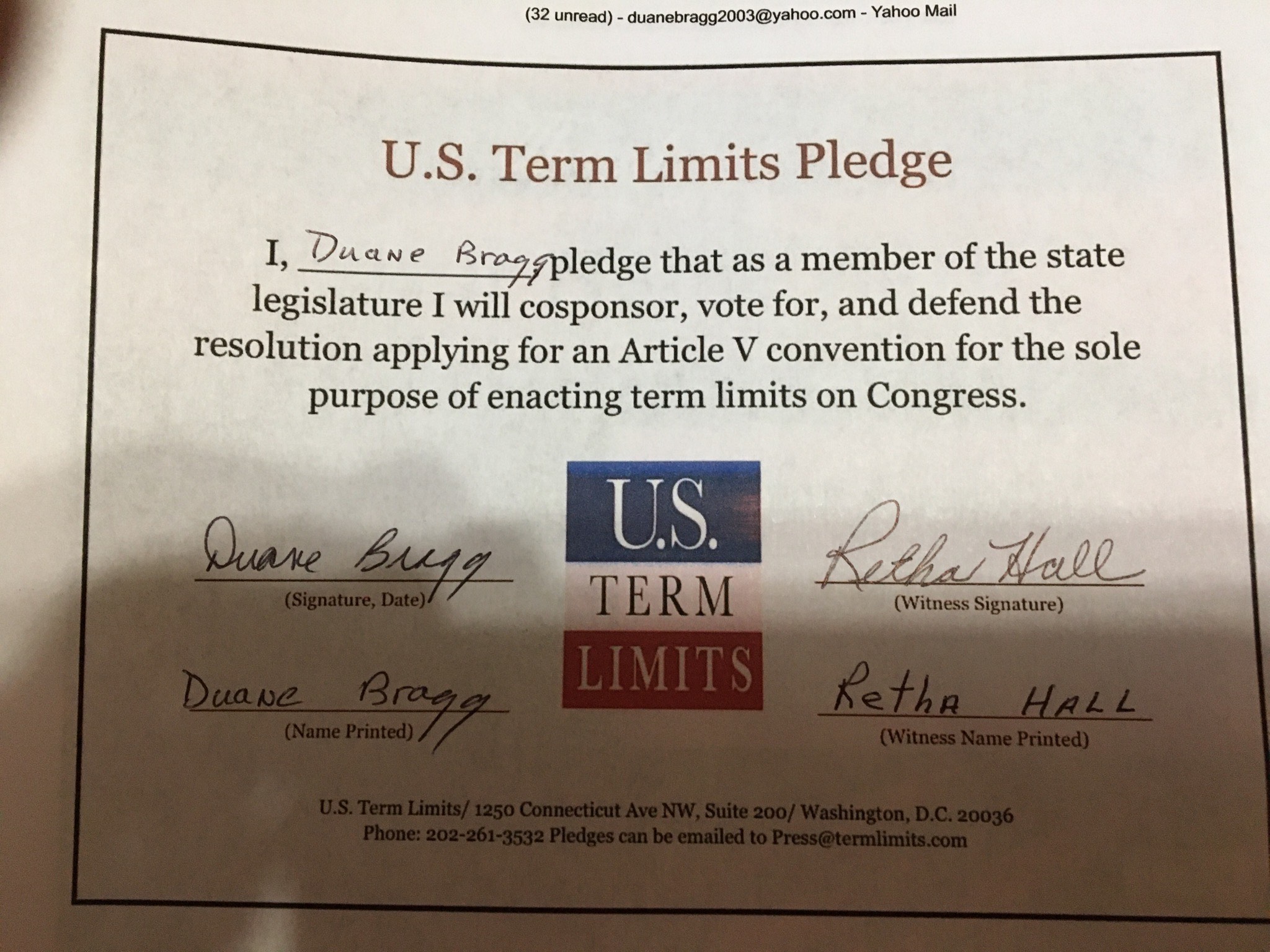 Duane Bragg Pledges to Support Congressional Term Limits