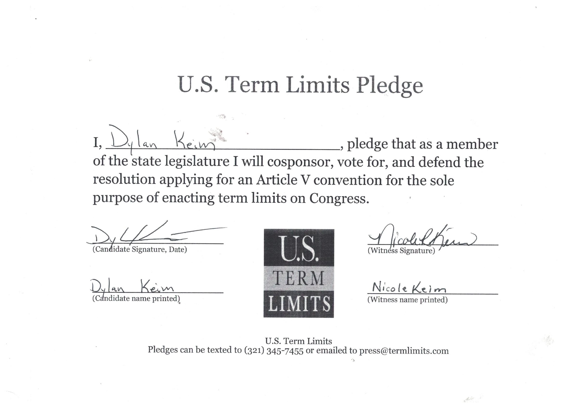Dylan Keim Pledges to Support Congressional Term Limits