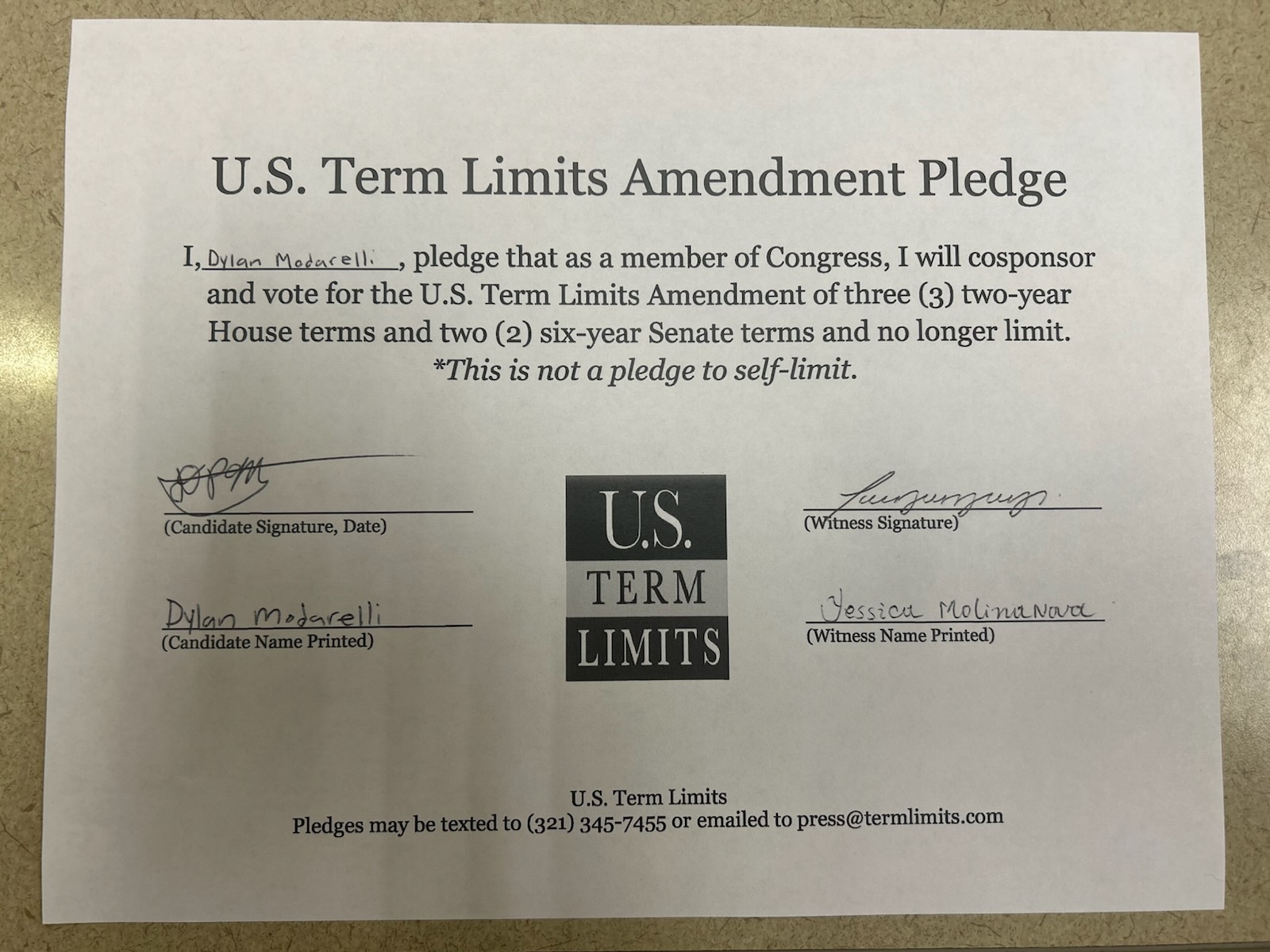 Washington D.C. – U.S. Term Limits (USTL), the leader in the non-partisan national movement to limit terms for elected officials, praises 2026 U.S. House candidate for Florida, Dylan Modarelli (district 19), for signing the pledge for an amendment to term limit Congress. Previously, candidates Howard Sapp, Mike Pedersen, Jim Schwartzel and Jim Oberweis also signed the pledge.