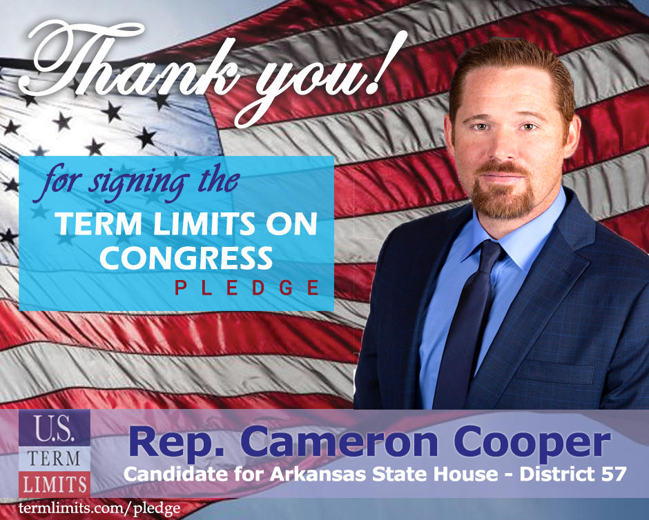 The U.S. Term Limits amendment pledge is provided to every announced candidate for federal office. It reads, “I pledge that as a member of Congress, I will cosponsor and vote for the U.S. Term Limits amendment of three (3) House terms and two (2) Senate terms and no longer limit.”