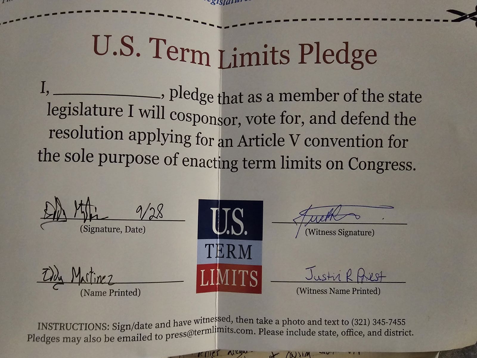 The U.S. Term Limits pledge is provided to candidates and members of state legislatures. It reads, “I pledge that, as a member of the state legislature, I will cosponsor, vote for, and defend the resolution applying for an Article V convention for the sole purpose of enacting term limits on Congress.”