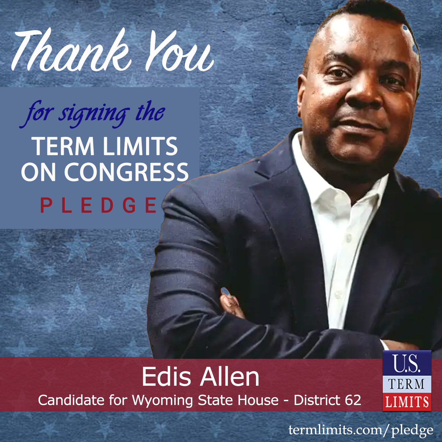 Glenrock, WY– U.S. Term Limits (USTL), the leader in the national, non-partisan movement to limit terms for elected officials, is gathering support from state lawmakers across the nation. Its mission is to get 34 states to apply for an amendment proposal convention specific to term limits on Congress. Wyoming state house candidate, Edis Allen (district 62), has committed support for term limits on Congress by signing the term limits convention pledge. He is the first signer in this race.