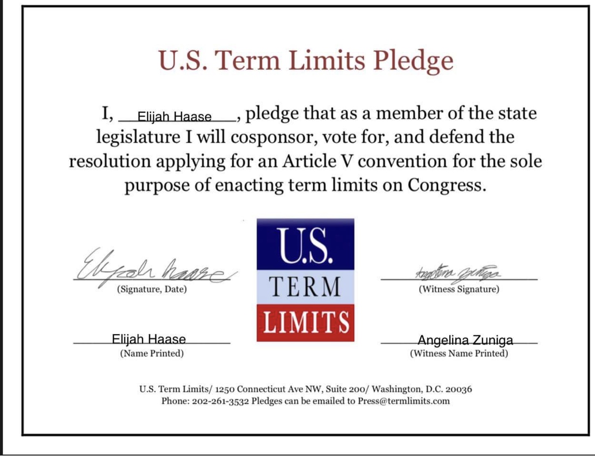 USTL President, Philip Blumel, commented on Haase’s pledge saying, “Elijah’s support of term limits shows that there are individuals who are willing to listen to the majority of voters who want term limits. America needs a Congress that will be served by citizen legislators, not career politicians.”