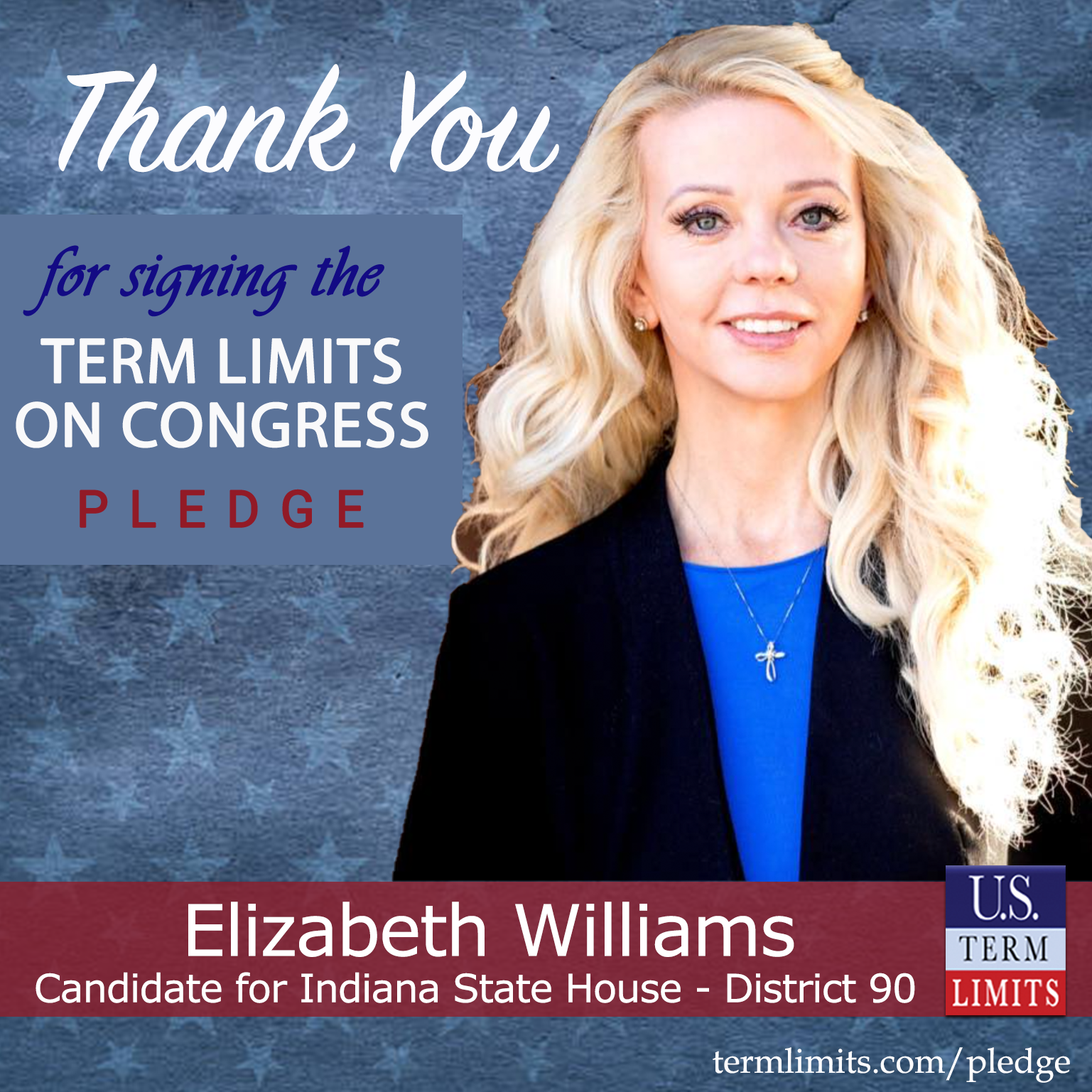 Acton, IN – U.S. Term Limits (USTL), the leader in the national, non-partisan movement to limit terms for elected officials, is gathering support from state lawmakers across the nation. Its mission is to get 34 states to apply for an amendment proposal convention specific to term limits on Congress. Indiana state house candidate, Elizabeth Williams (District 90), has committed support for term limits on Congress by signing the term limits convention pledge. Previously, candidate Andrew Ireland also signed the pledge.