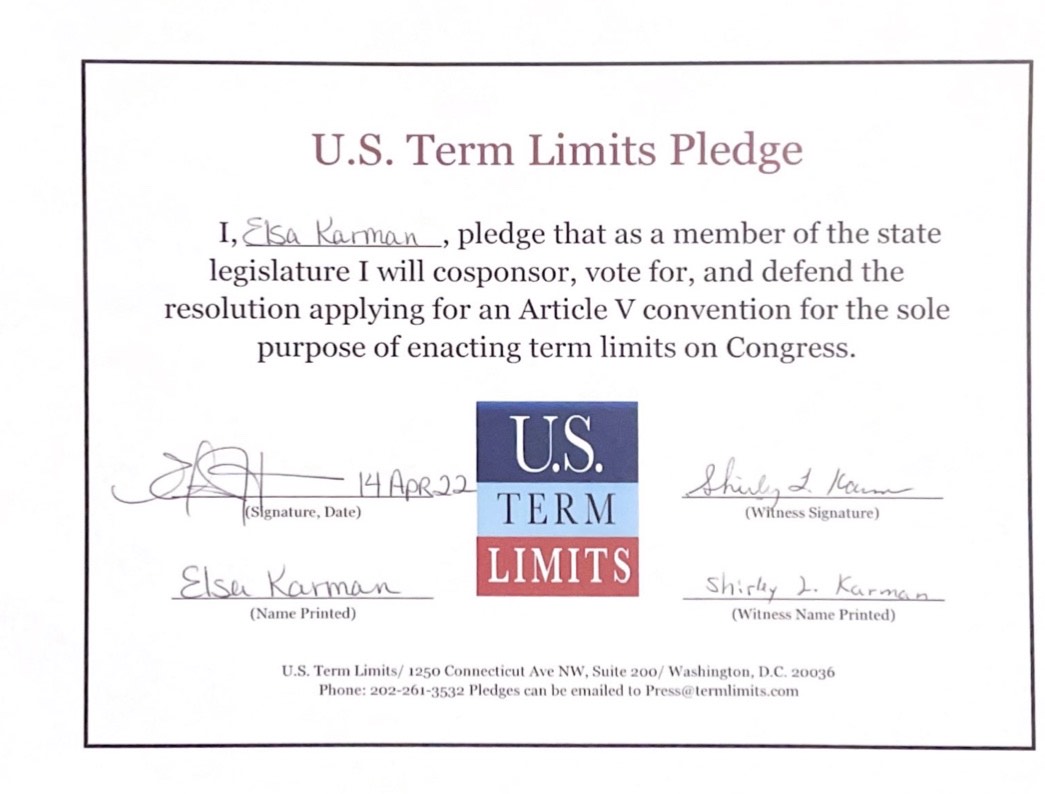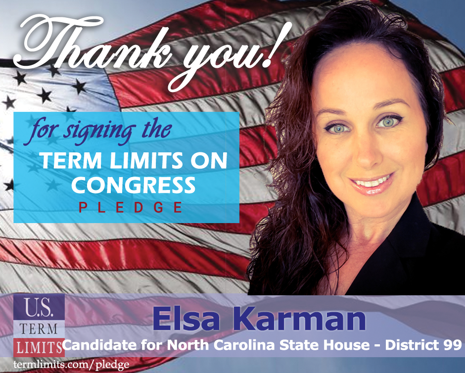 Charlotte, NC – U.S. Term Limits (USTL), the leader in the national, non-partisan movement to limit terms for elected officials, is gathering support from state lawmakers across the nation. Its mission is to get 34 states to apply for an amendment proposal convention specific to term limits on Congress. North Carolina state house candidate, Elsa Karman (district 99), has committed support for term limits on Congress by signing the U.S. Term Limits pledge. Karman is the first signer in this race.
