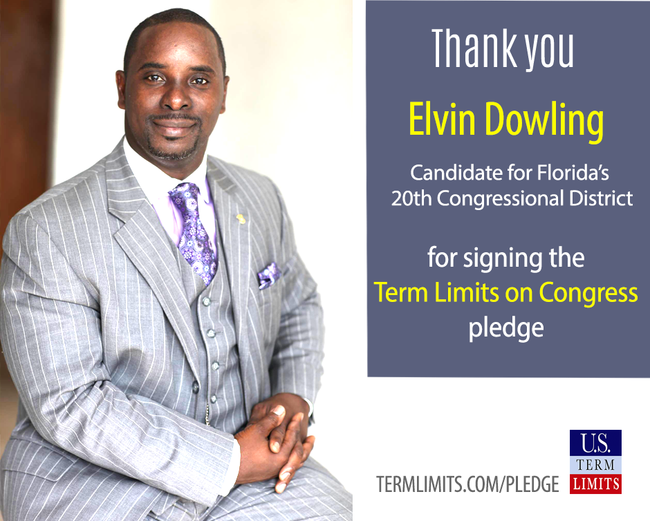 Washington D.C. – U.S. Term Limits (USTL), the leader in the non-partisan national movement to limit terms for elected officials, praises 2022 U.S. house candidate for Florida, Elvin Dowling (district 20), for signing the pledge for an amendment to term limit Congress. Previously, candidates Bernard Sansaricq and Leonard Serratore also signed the pledge.