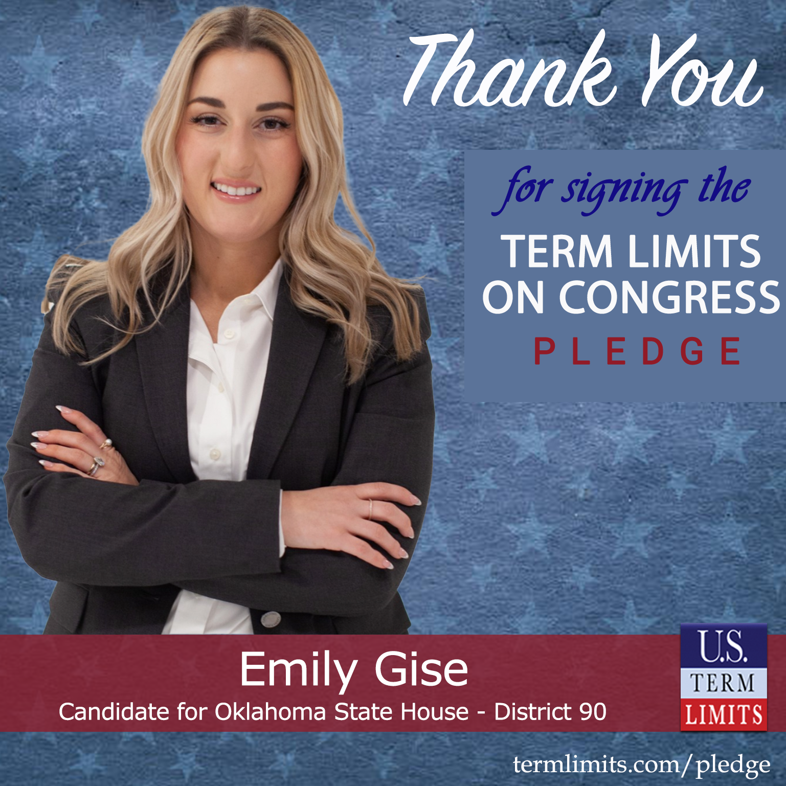 Oklahoma City, OK – U.S. Term Limits (USTL), the leader in the national, non-partisan movement to limit terms for elected officials, is gathering support from state lawmakers across the nation. Its mission is to get 34 states to apply for an amendment proposal convention specific to term limits on Congress. Oklahoma state house candidate, Emily Gise (District 90), has committed support for term limits on Congress by signing the term limits convention pledge.