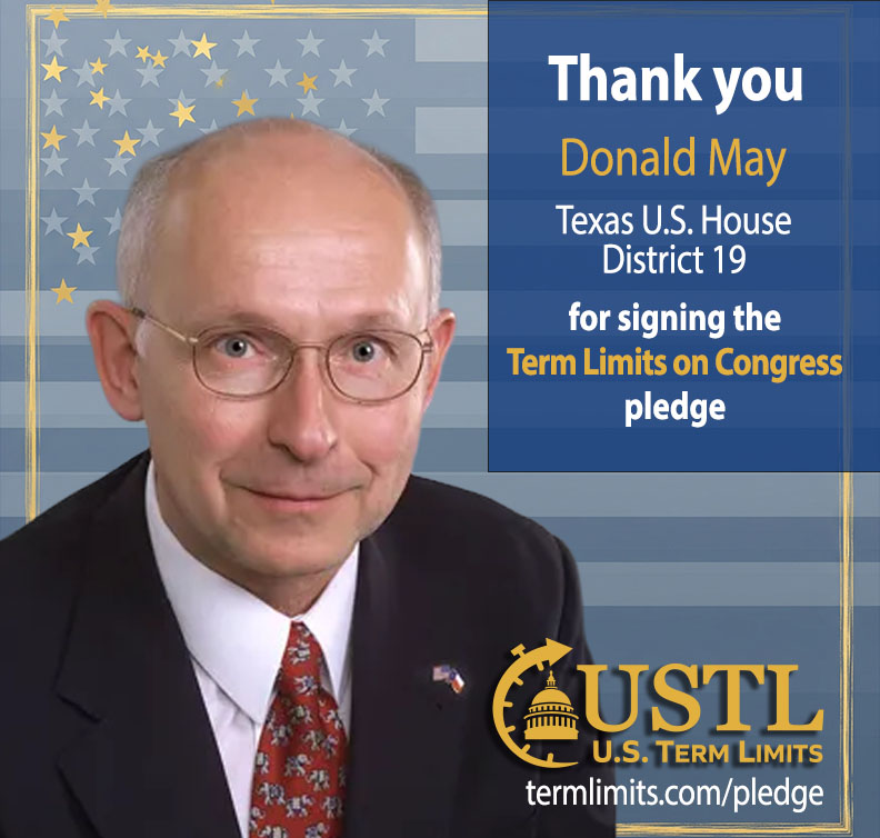 The U.S. Term Limits amendment pledge is provided to every announced candidate for federal office. It reads, “I pledge that as a member of Congress, I will cosponsor and vote for the U.S. Term Limits amendment of three (3) House terms and two (2) Senate terms and no longer limit.” The U.S. Term Limits constitutional amendment has been introduced in both the U.S. Senate by Senator Ted Cruz and his colleagues (SJR3) and the U.S. House by Representative Ralph Norman (HJR12).