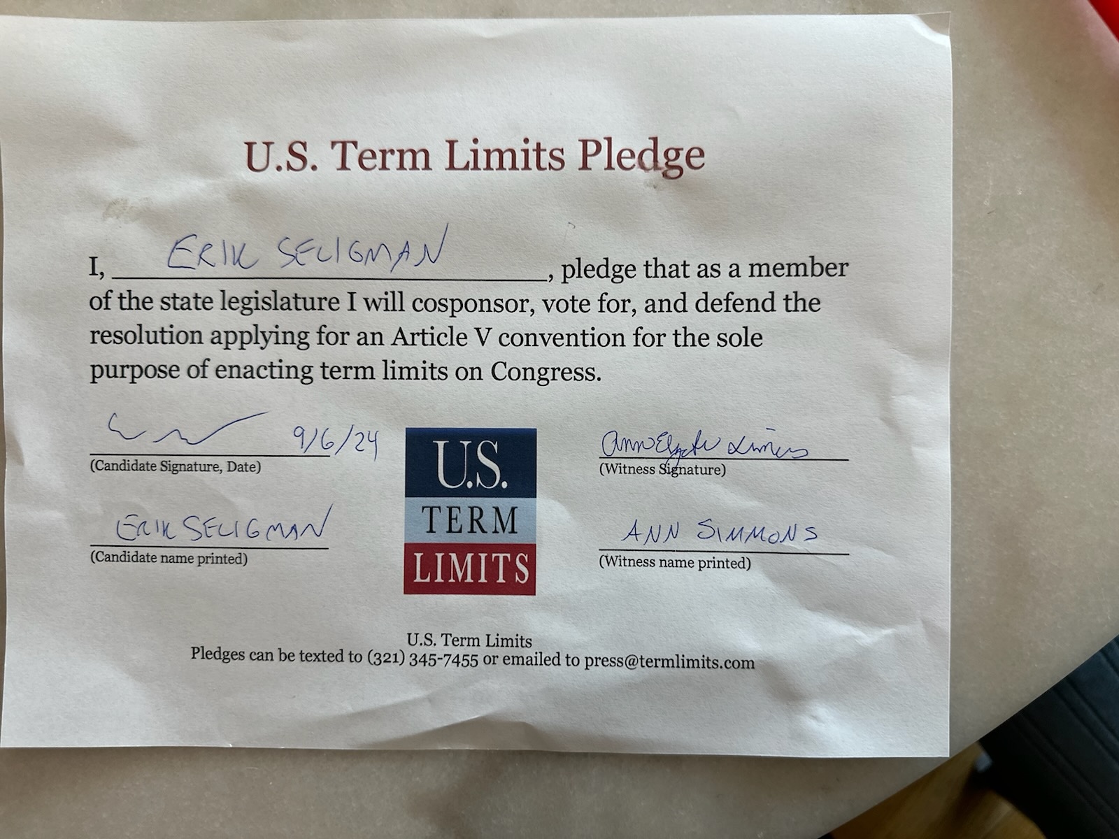Erik Seligman Pledges to Support Congressional Term Limits