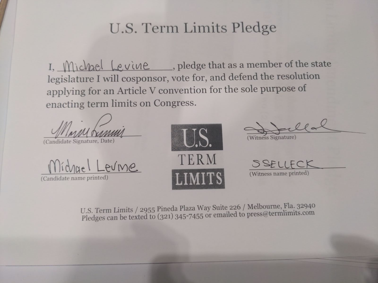USTL President, Philip Blumel, commented on Levine’s pledge saying, “Michael’s strong support of term limits shows that there are individuals who are willing to listen to the majority of voters who want term limits. America needs a Congress that will be served by citizen legislators, not career politicians.”