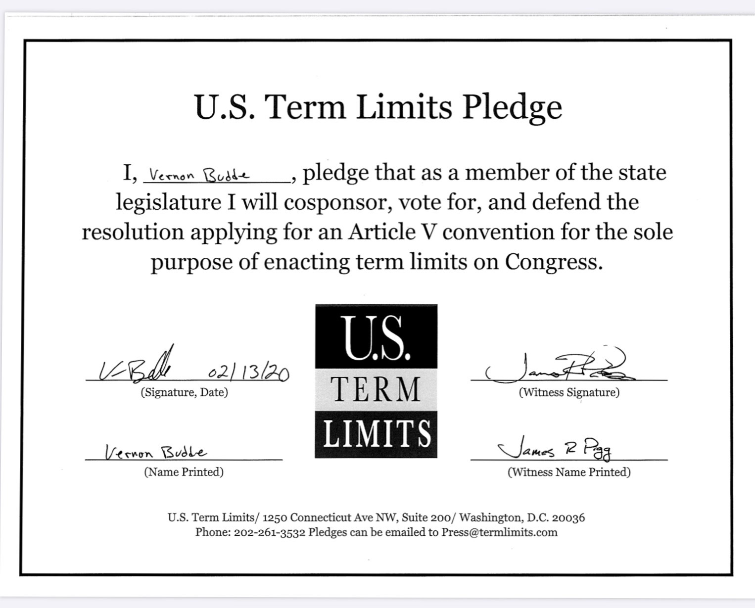 The U.S. Term Limits pledge is provided to candidates and members of state legislatures. It reads, “I pledge that, as a member of the state legislature, I will cosponsor, vote for, and defend the resolution applying for an Article V convention for the limited purpose of enacting term limits on Congress.”