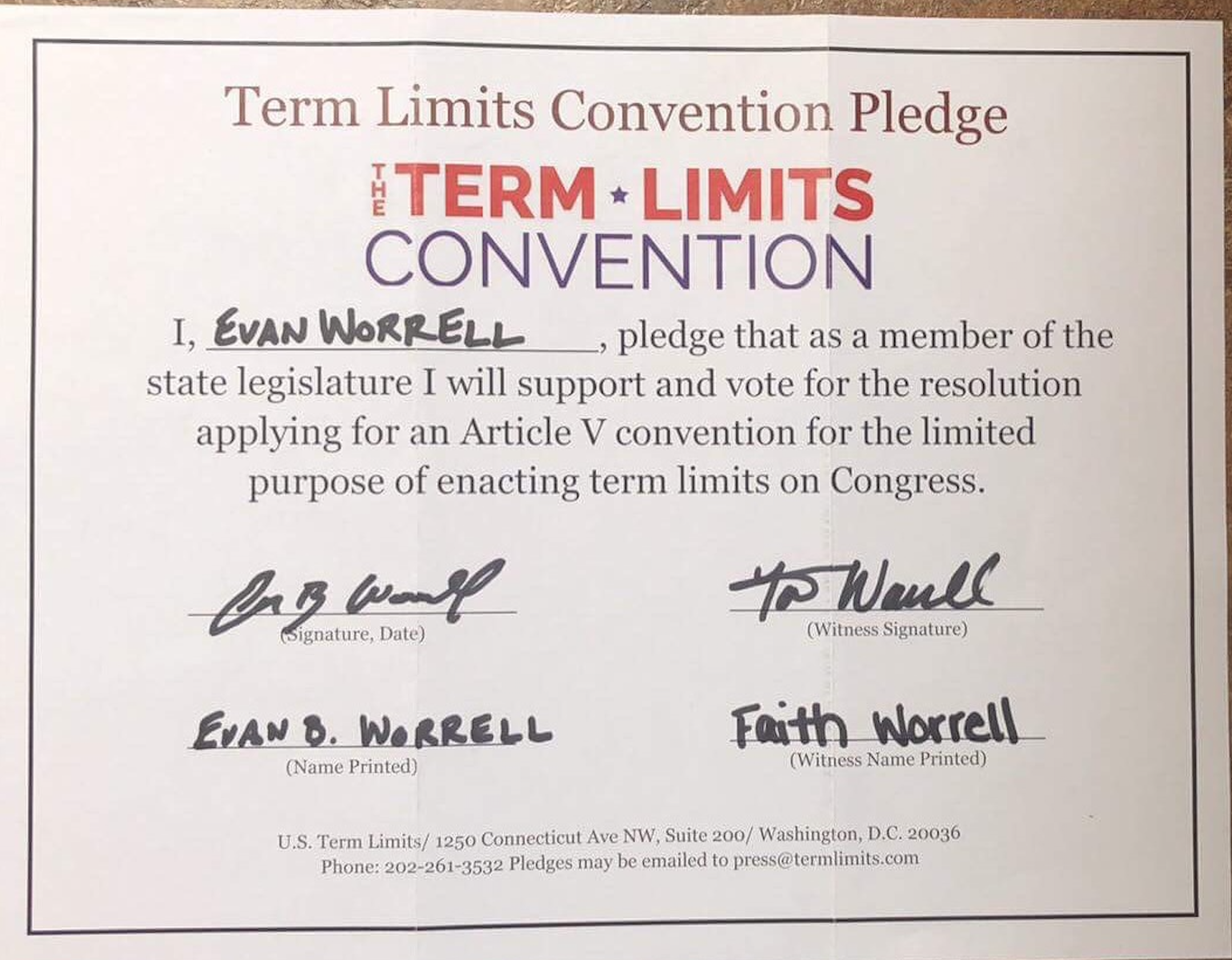 U.S. Term Limits Praises Evan Worrell for Signing Pledge