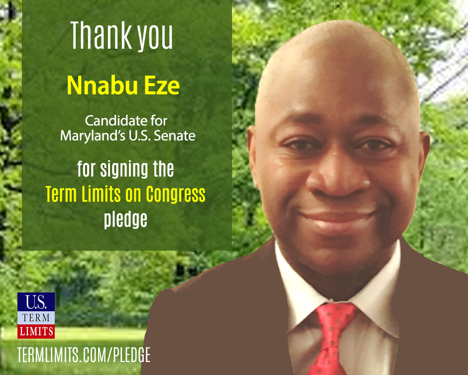 Washington D.C. – U.S. Term Limits (USTL), the leader in the non-partisan national movement to limit terms for elected officials, praises 2022 U.S. Senate candidate for Maryland, Eze Nnubu, for signing the pledge for an amendment to term limit Congress. Previously, candidates John Thormann and James Tarantin also signed the pledge.