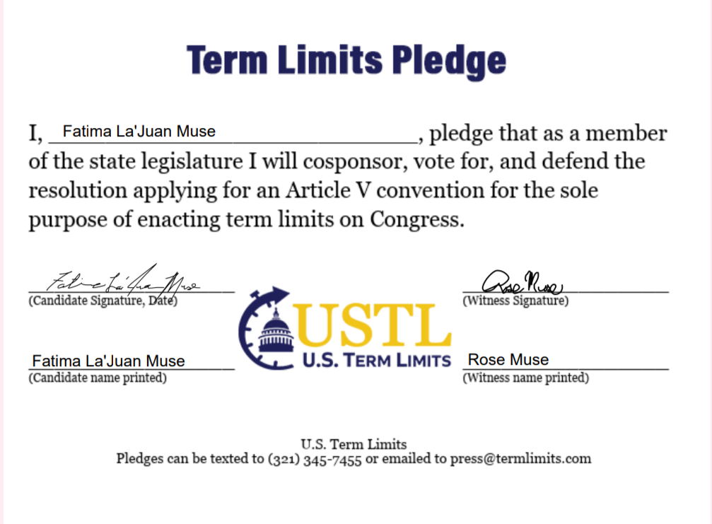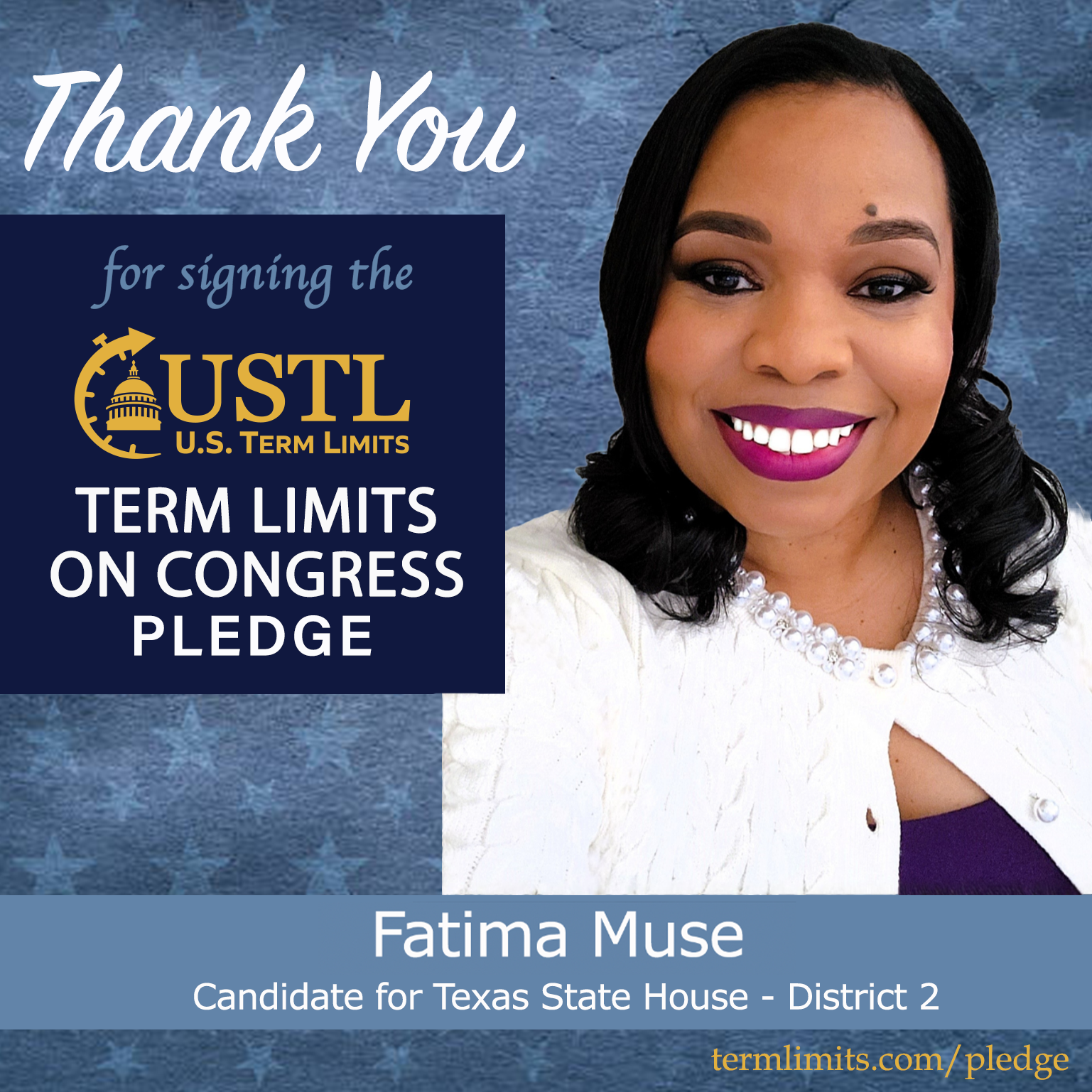 Canton, TX – U.S. Term Limits (USTL), the leader in the national, non-partisan movement to limit terms for elected officials, is gathering support from state lawmakers across the nation. Its mission is to get 34 states to apply for an amendment proposal convention specific to term limits on Congress. 2026 Texas state house  candidate, Fatima Muse (district 2), has committed support for term limits on Congress by signing the term limits convention pledge. Previously, Rep. Brent Money also signed the pledge.