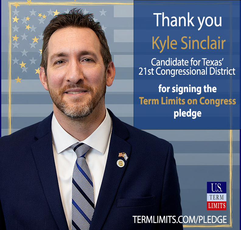Washington D.C. – U.S. Term Limits (USTL), the leader in the non-partisan national movement to limit terms for elected officials, praises 2026 U.S. House of Representatives candidate for Texas, Kyle Sinclair (district 21), for signing the pledge for an amendment to term limit Congress. Previously, candidates Paul Rojas, Mark Teixeira, Daniel Betts, and Zeke Enriquez also signed the pledge.