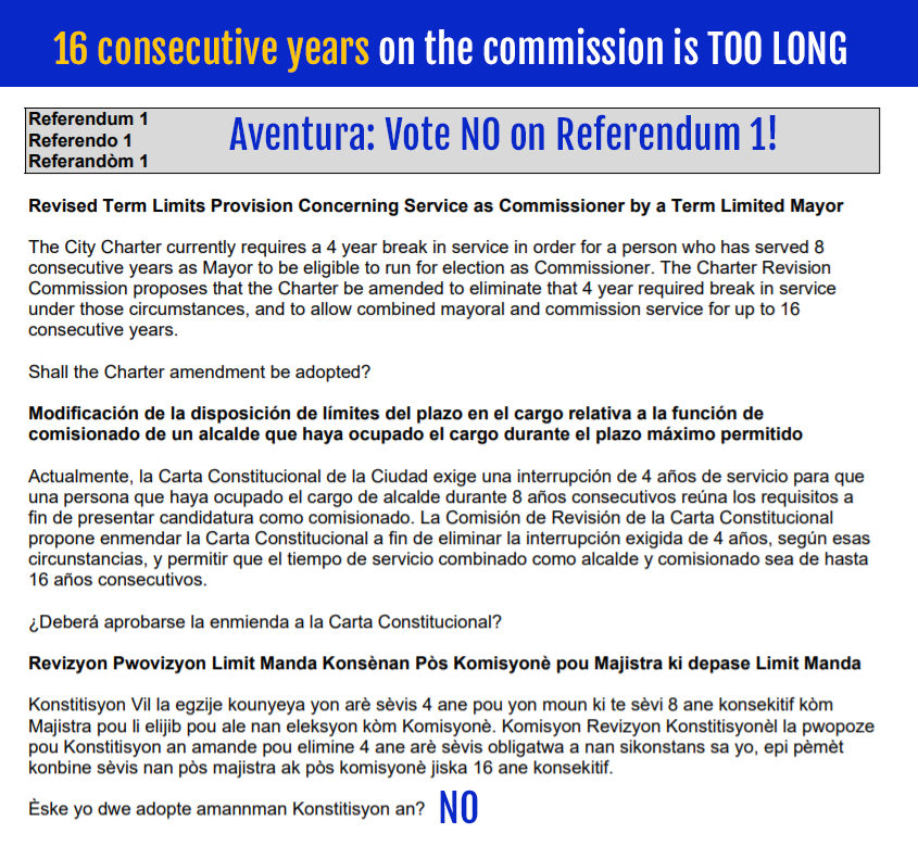 Aventura’s ballot question is looking to increase the term limits for council members who also serve as mayor to 16 consecutive years. That is way too long. Please vote NO on referendum 1 to stop the mayor from serving 16 years on the city commission. UPDATE 4/30: The voters of Aventura overwhelmingly rejected allowing the mayor to serve 16 years on the city commission 70-30%!