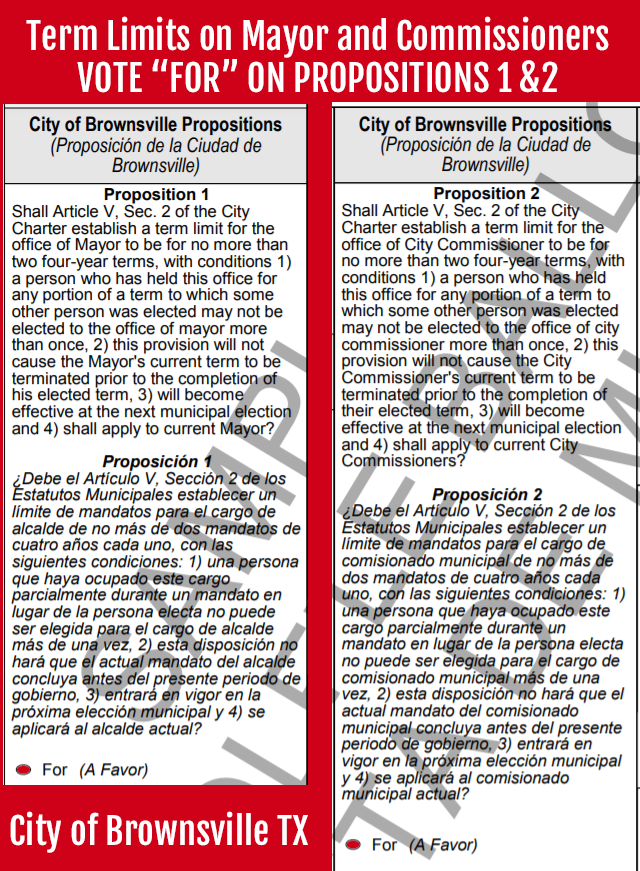 Brownsville, Texas has two term limits propositions on the ballot. Proposition 1 implements term limits on the Mayor and Proposition 2 places term limits on the City Commissioners. Voting “FOR” both propositions 1 & 2 will help the city by increasing transparency, getting more citizens involved in the processes of government, and help bring diverse perspectives to the city commission.