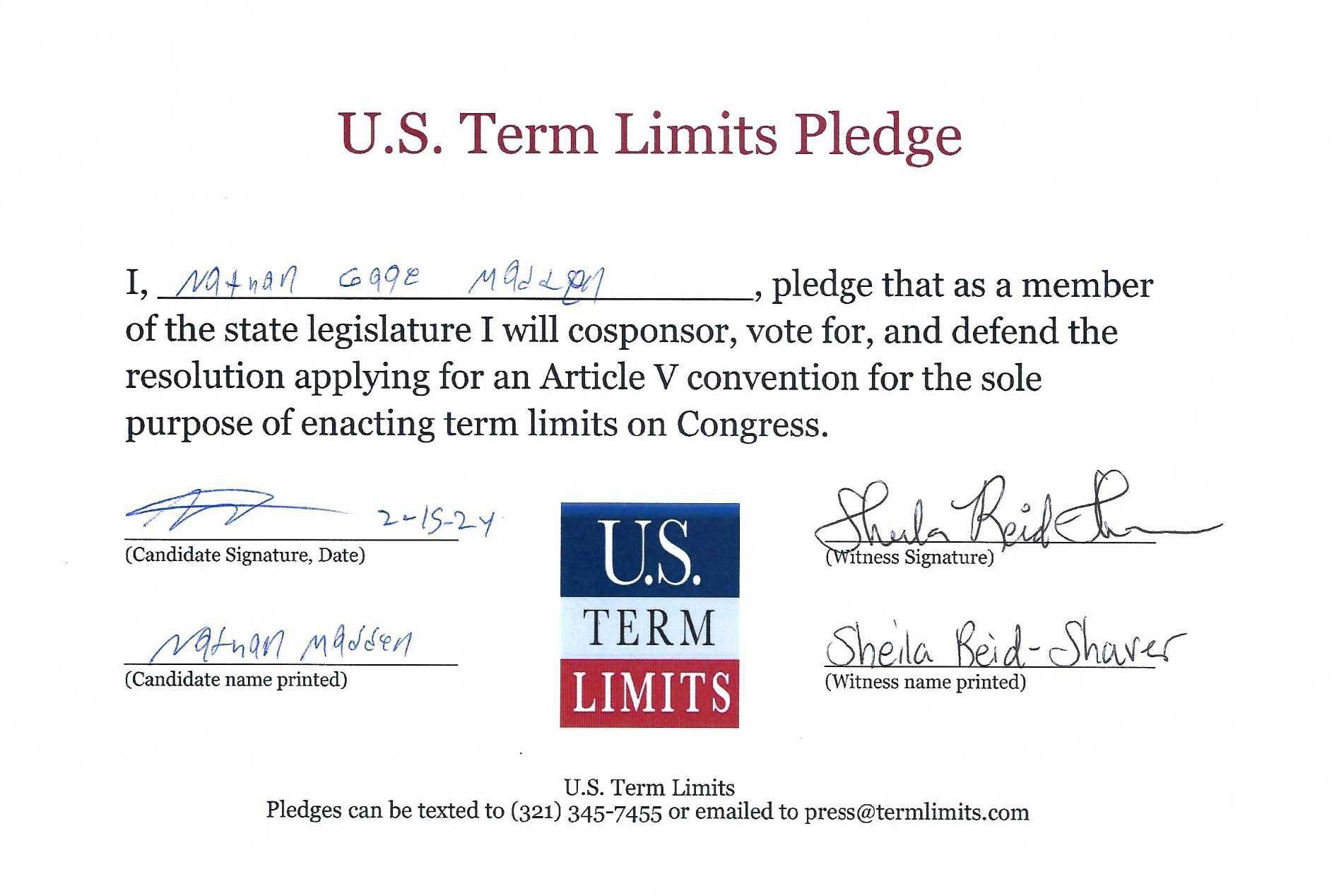 The U.S. Term Limits pledge is provided to candidates and members of state legislatures. It reads, “I pledge that, as a member of the state legislature, I will cosponsor, vote for, and defend the resolution applying for an Article V convention for the sole purpose of enacting term limits on Congress.”