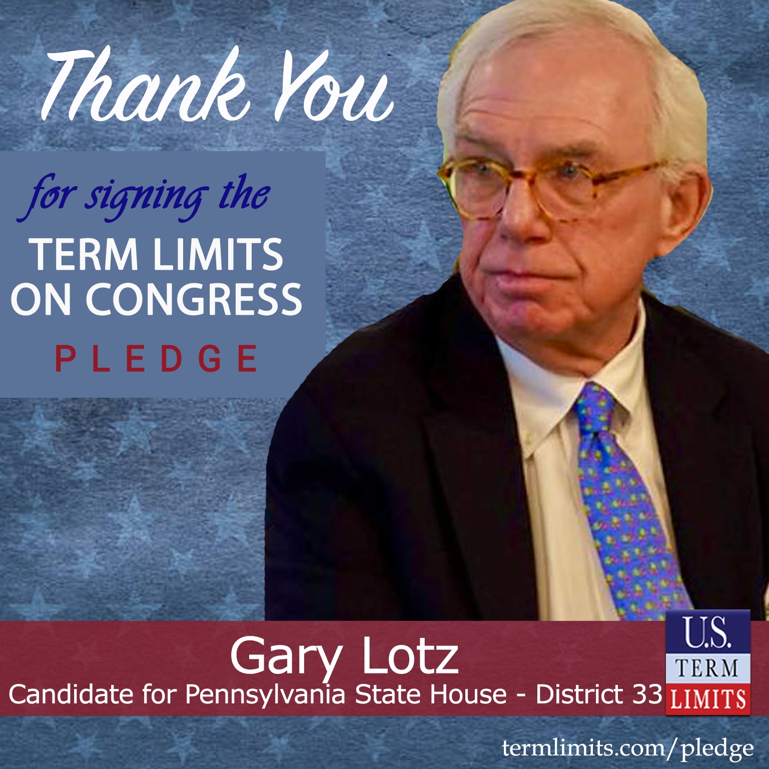 Cheswick, PA – U.S. Term Limits (USTL), the leader in the national, non-partisan movement to limit terms for elected officials, is gathering support from state lawmakers across the nation. Its mission is to get 34 states to apply for an amendment proposal convention specific to term limits on Congress. Pennsylvania state house candidate, Gary Lotz (District 33), has committed support for term limits on Congress by signing the term limits convention pledge. Lotz is the first signer in this race.
