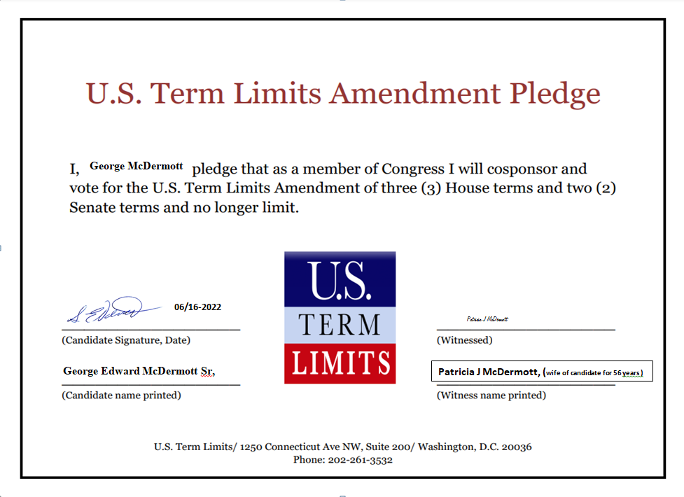 Washington D.C. – U.S. Term Limits (USTL), the leader in the non-partisan national movement to limit terms for elected officials, praises 2022 U.S. house candidate for Maryland, George McDermott (district 4), for signing the pledge for an amendment to term limit Congress. Previously, candidate Dr. Matthew Fogg also signed the pledge. The primary election is scheduled for July 19, 2022.
