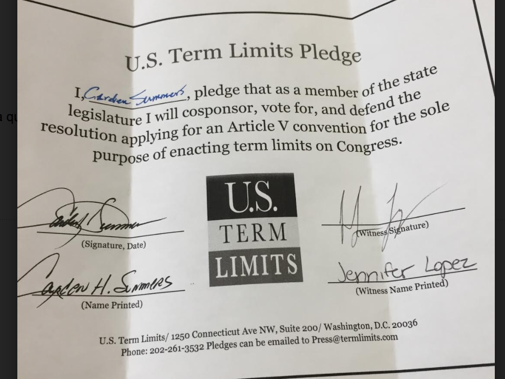 The U.S. Term Limits pledge is provided to candidates and members of state legislatures. It reads, “I pledge that, as a member of the state legislature, I will cosponsor, vote for, and defend the resolution applying for an Article V convention for the limited purpose of enacting term limits on Congress.”