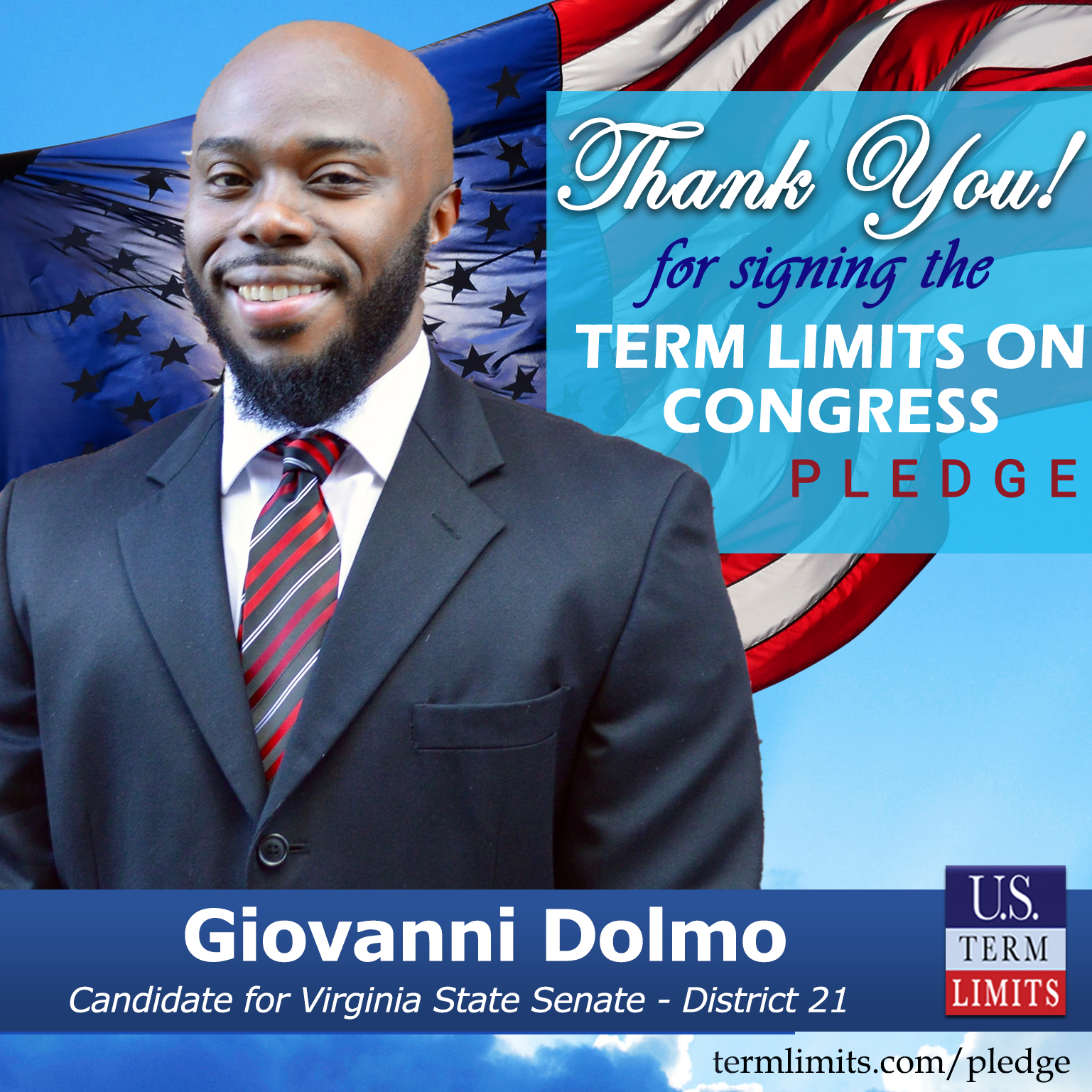 Norfolk, VA – U.S. Term Limits (USTL), the leader in the national, non-partisan movement to limit terms for elected officials, is gathering support from state lawmakers across the nation. Its mission is to get 34 states to apply for an amendment proposal convention specific to term limits on Congress. Virginia state senate candidate, Giovanni Dolmo (District 21), has committed support for term limits on Congress by signing the term limits convention pledge. Dolmo is the first signer in this race.