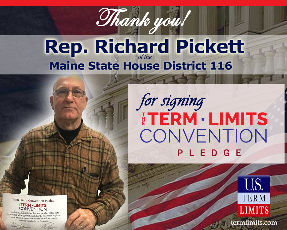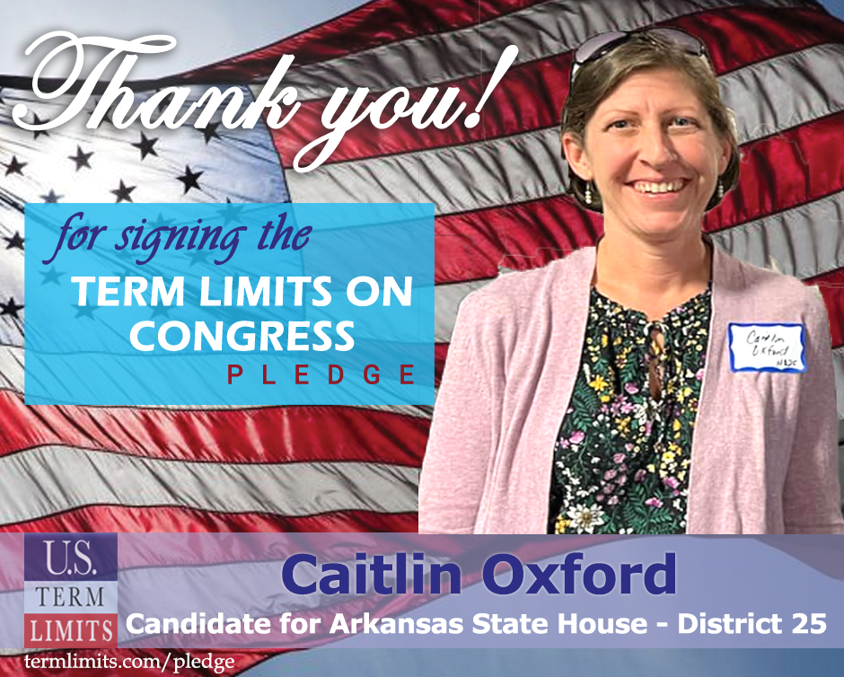 The U.S. Term Limits pledge is provided to candidates and members of state legislatures. It reads, “I pledge that, as a member of the state legislature, I will cosponsor, vote for, and defend the resolution applying for an Article V convention for the limited purpose of enacting term limits on Congress.”