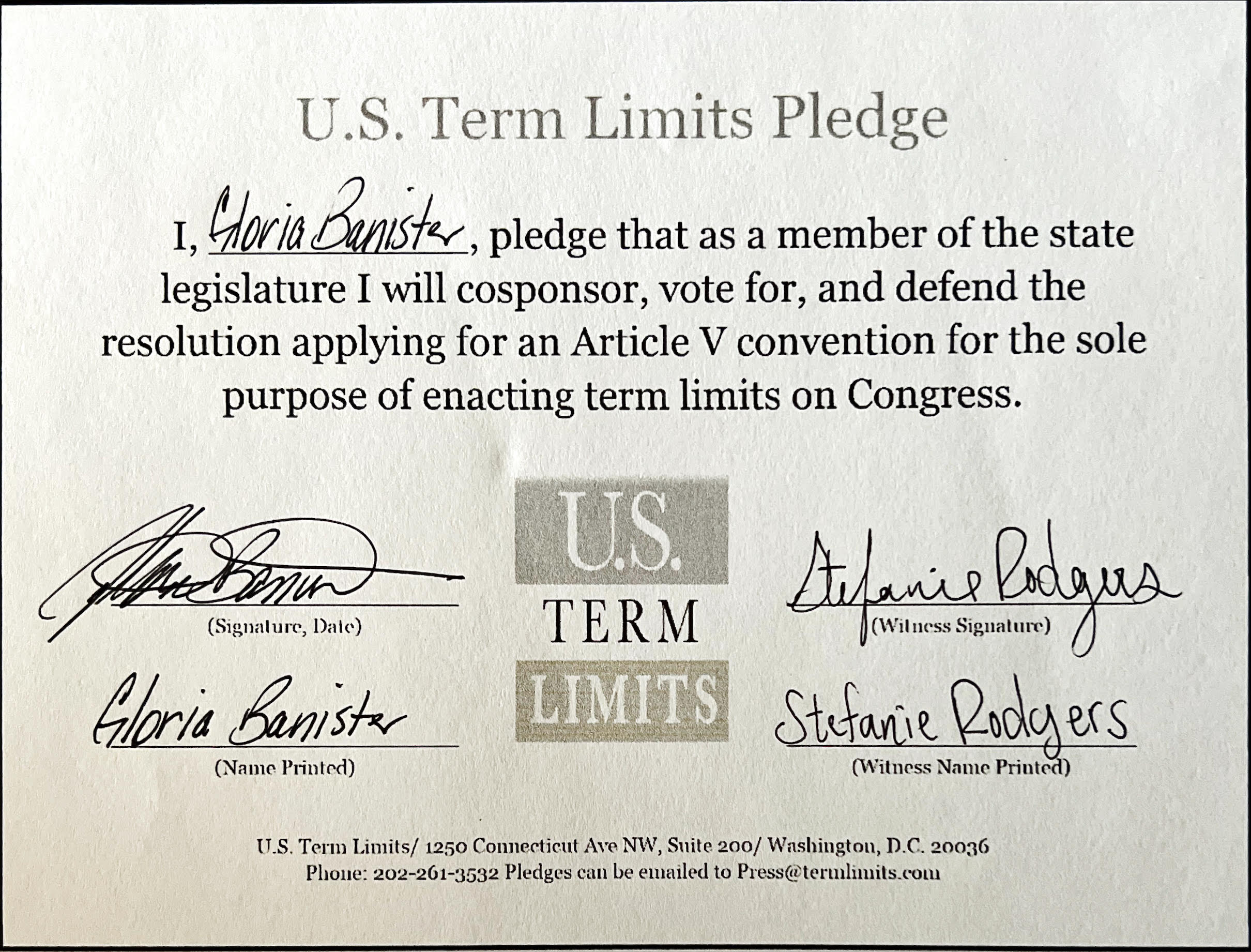 Gloria Banister Pledges to Support Congressional Term Limits