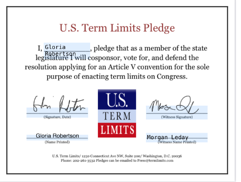 The U.S. Term Limits pledge is provided to candidates and members of state legislatures. It reads, “I pledge that, as a member of the state legislature, I will cosponsor, vote for, and defend the resolution applying for an Article V convention for the sole purpose of enacting term limits on Congress.”