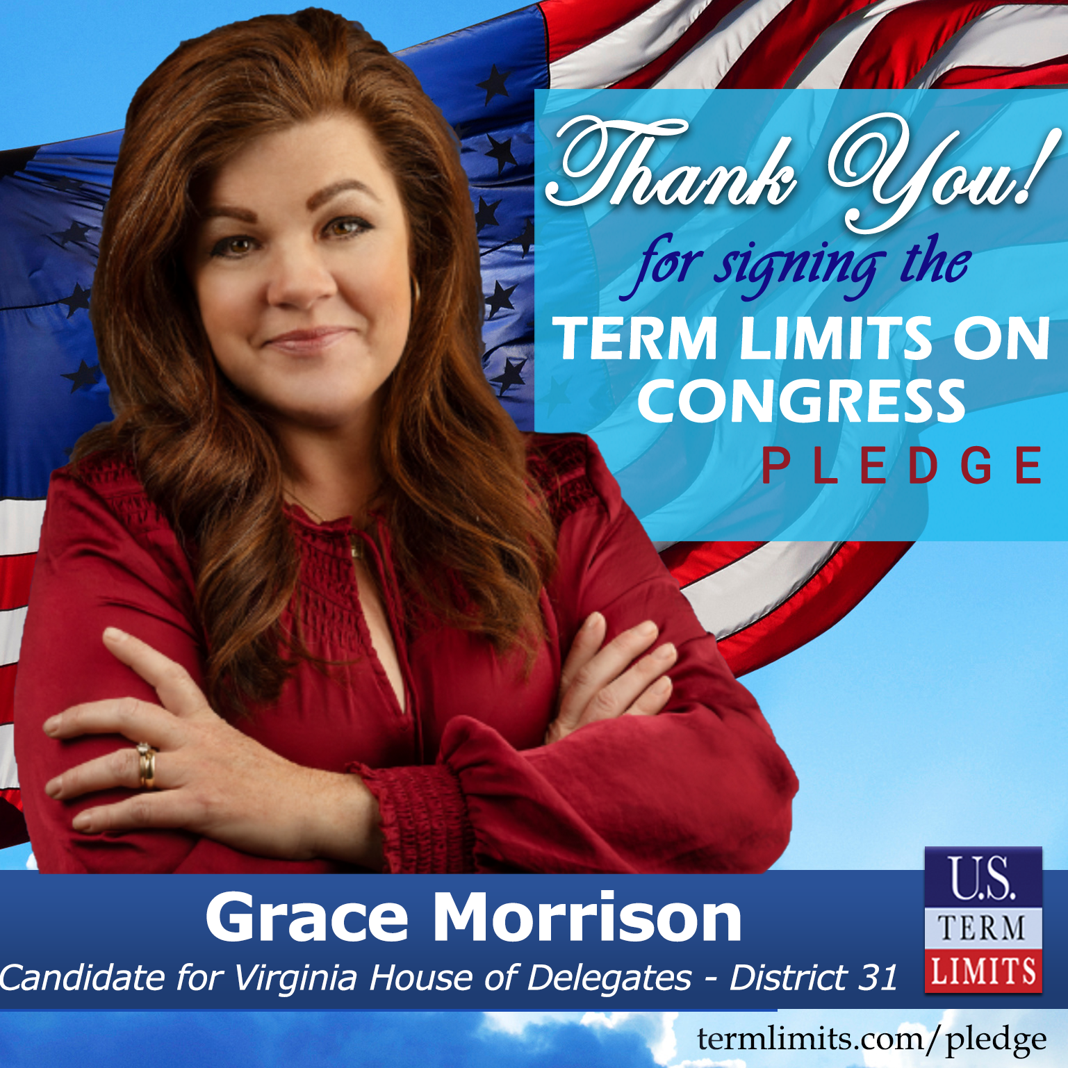 Winchester, VA – U.S. Term Limits (USTL), the leader in the national, non-partisan movement to limit terms for elected officials, is gathering support from state lawmakers across the nation. Its mission is to get 34 states to apply for an amendment proposal convention specific to term limits on Congress. Virginia house of delegates candidate, Grace Morrison (District 31), has committed support for term limits on Congress by signing the term limits convention pledge. Morrison is the first signer in this race.