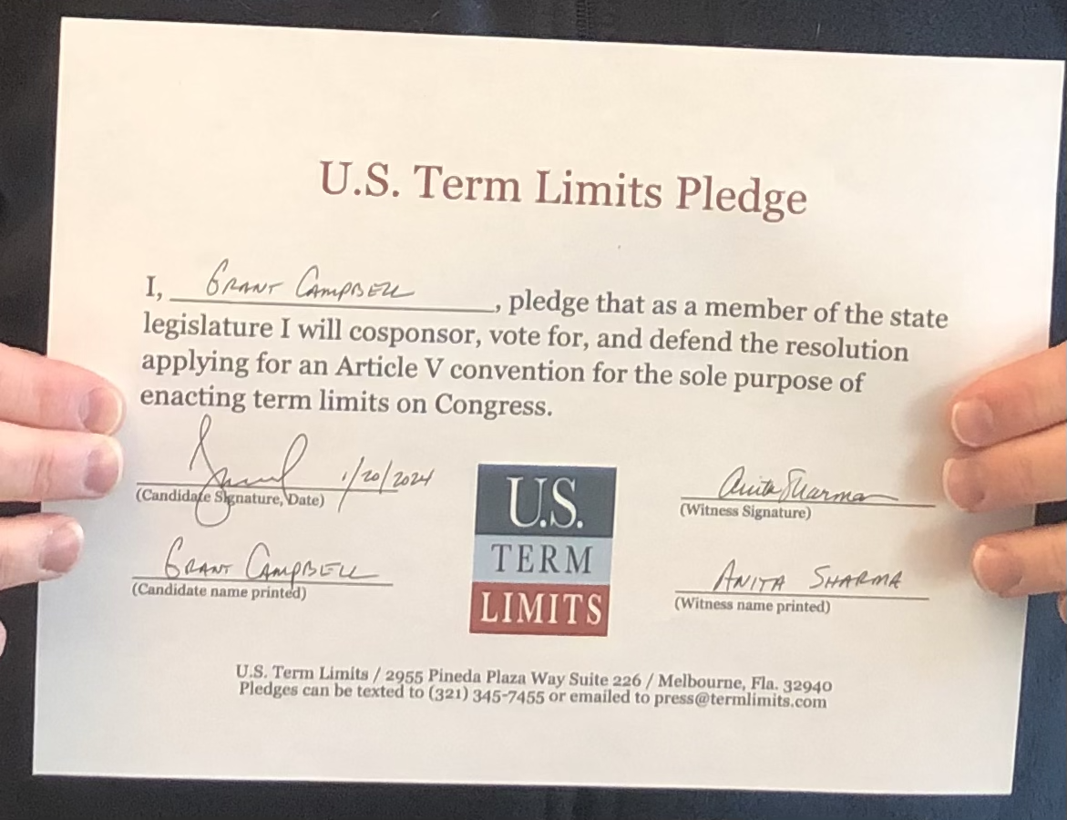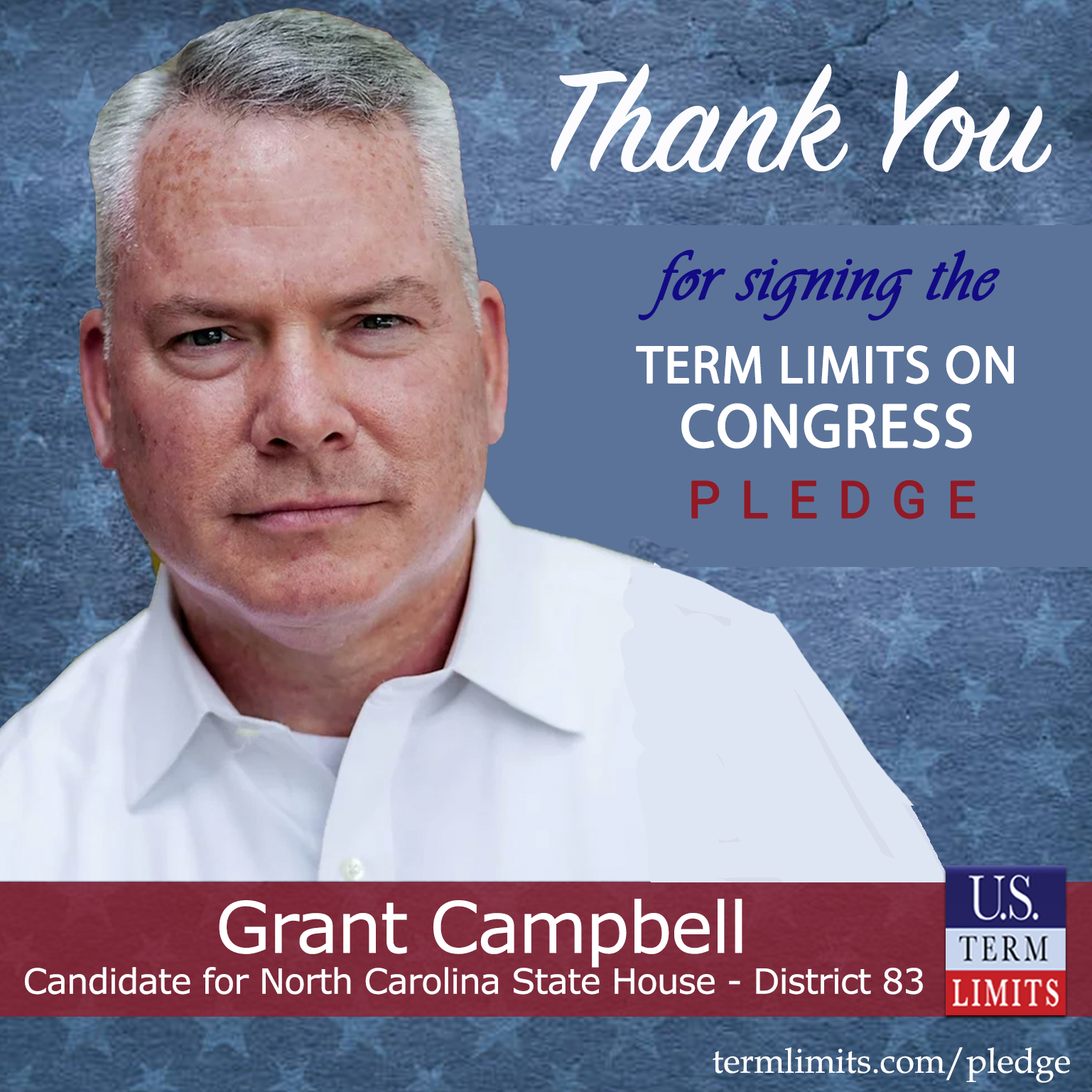 Raleigh, NC – U.S. Term Limits (USTL), the leader in the national, non-partisan movement to limit terms for elected officials, is gathering support from state lawmakers across the nation. Its mission is to get 34 states to apply for an amendment proposal convention specific to term limits on Congress. North Carolina state house candidate, Grant Campbell (District 83), has committed support for term limits on Congress by signing the term limits convention pledge. Campbell is the first signer in this race.