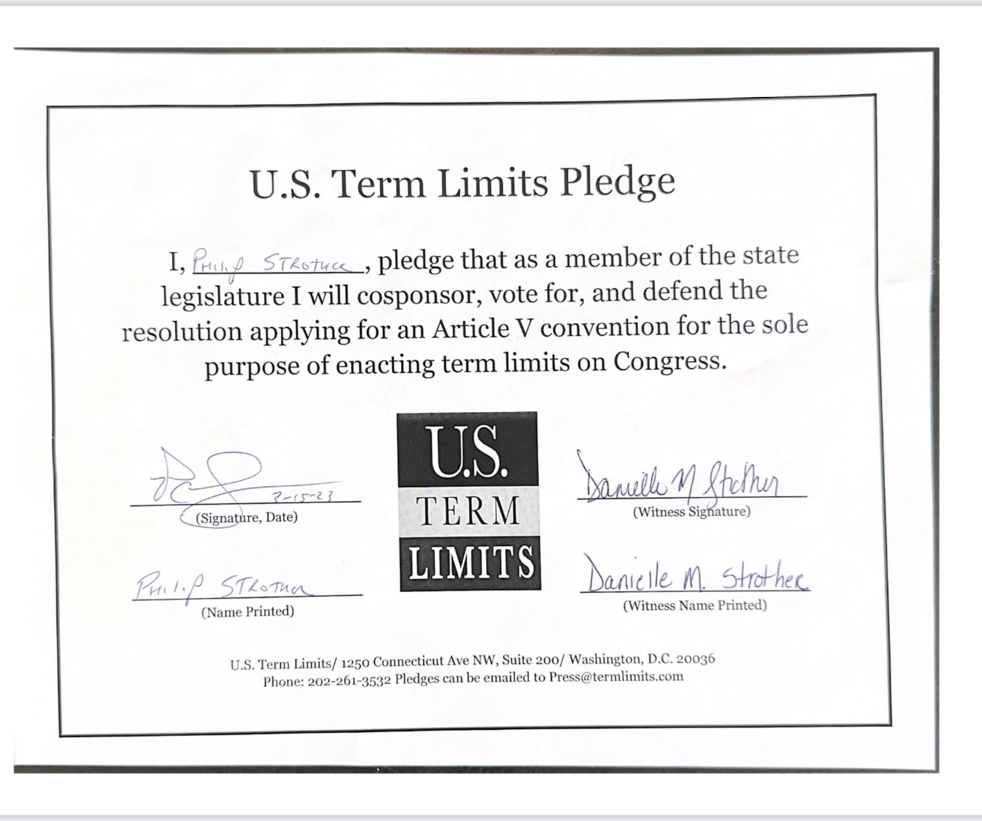 The U.S. Term Limits pledge is provided to candidates and members of state legislatures. It reads, “I pledge that, as a member of the state legislature, I will cosponsor, vote for, and defend the resolution applying for an Article V convention for the limited purpose of enacting term limits on Congress.”