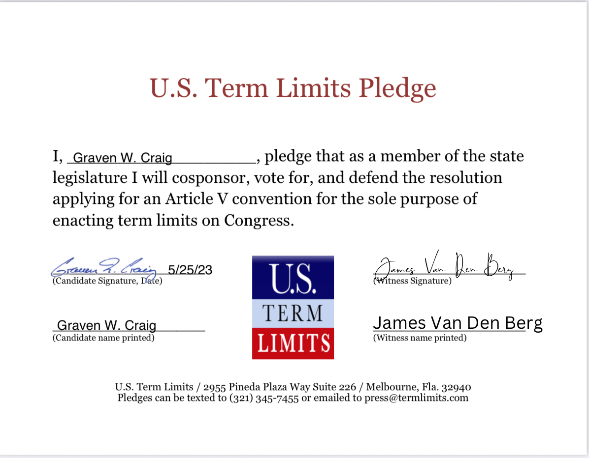 USTL President, Philip Blumel, commented on Craig’s and Strother’s pledges saying, “Graven’s and Philip’s support of term limits shows that there are individuals who are willing to listen to the majority of voters who want term limits. America needs a Congress that will be served by citizen legislators, not career politicians.”