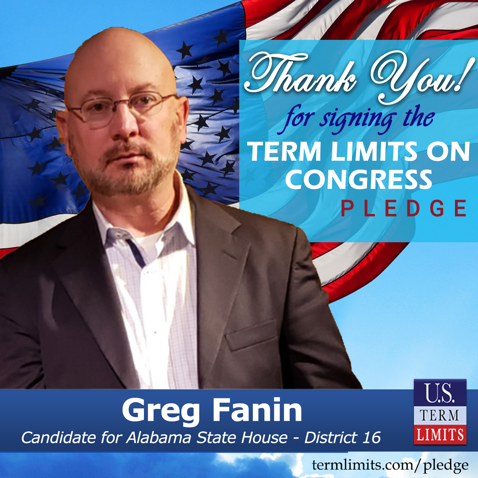 Tuscaloosa, AL – U.S. Term Limits (USTL), the leader in the national, non-partisan movement to limit terms for elected officials, is gathering support from state lawmakers across the nation. Its mission is to get 34 states to apply for an amendment proposal convention specific to term limits on Congress. Alabama state house candidate, Greg Fanin (District 16), has committed support for term limits on Congress by signing the Term Limits Convention pledge.