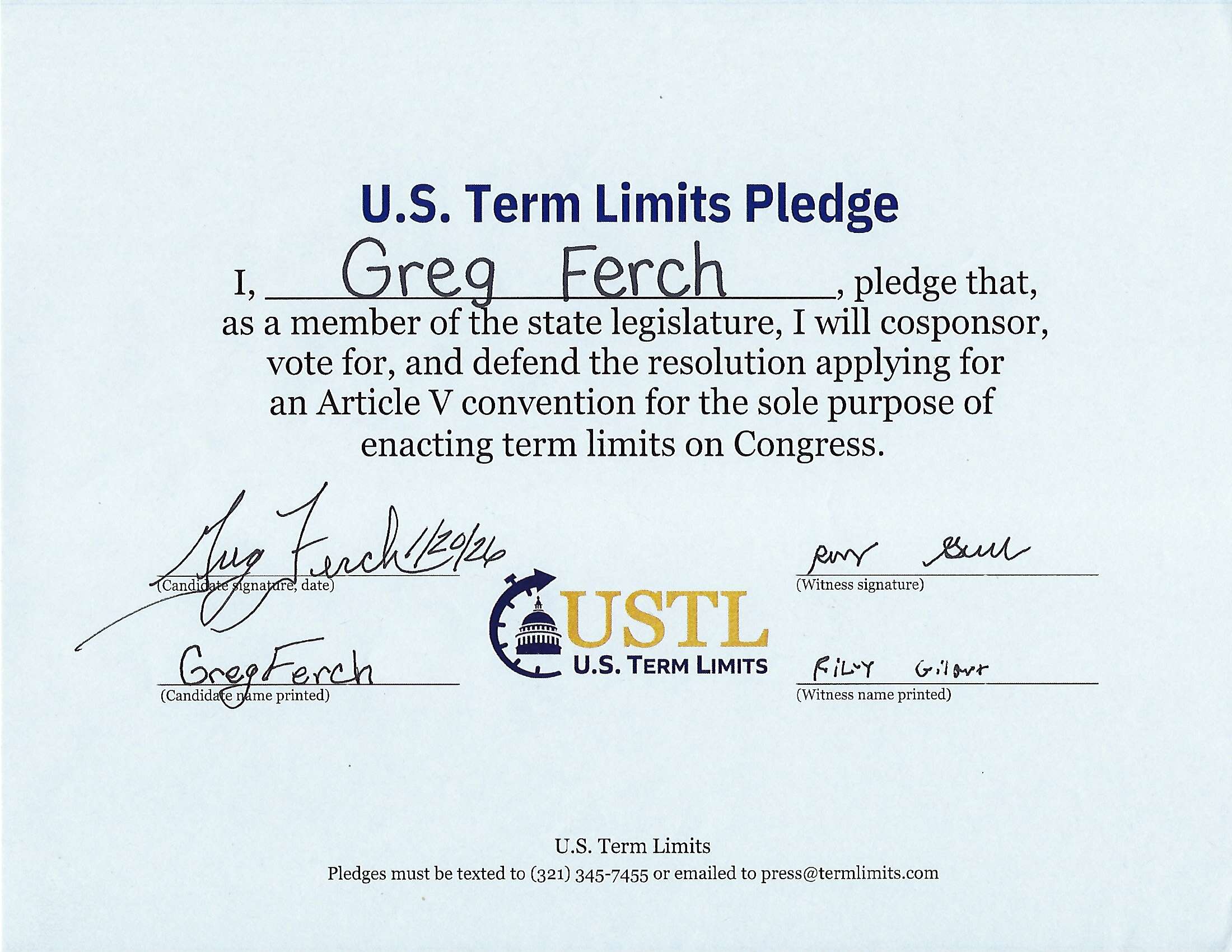 Greg Ferch Pledges to Support Congressional Term Limits