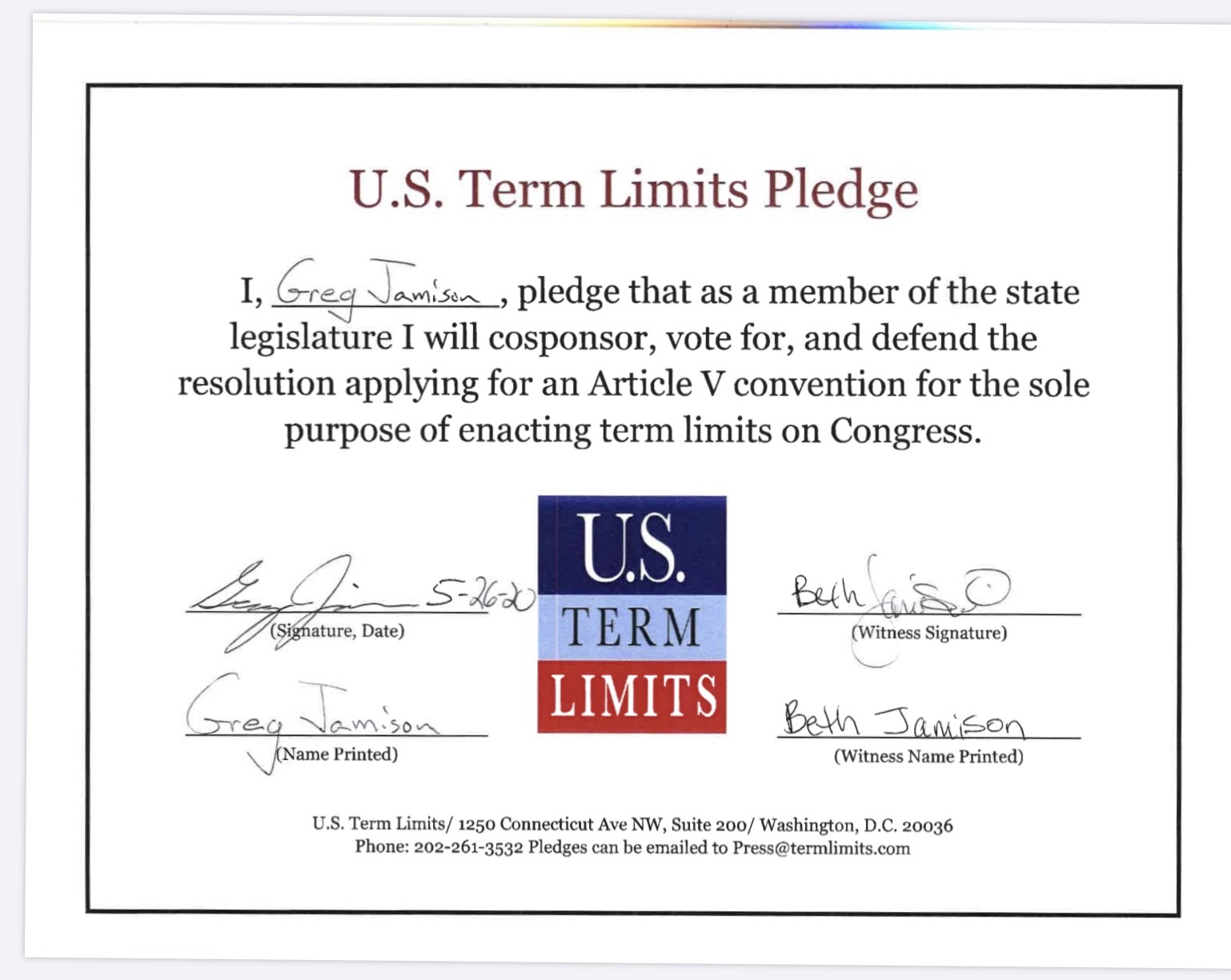 Greg Jamison Pledges to Support Congressional Term Limits