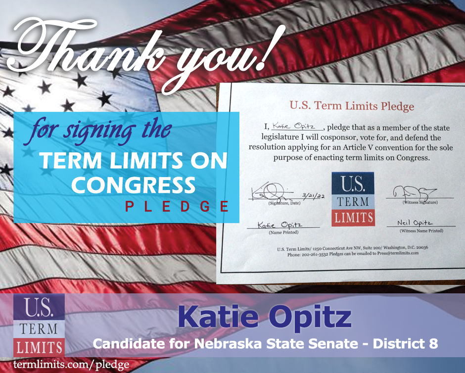The U.S. Term Limits pledge is provided to candidates and members of state legislatures. It reads, “I pledge that, as a member of the state legislature, I will cosponsor, vote for, and defend the resolution applying for an Article V convention for the limited purpose of enacting term limits on Congress.”