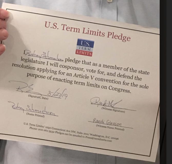 The U.S. Term Limits pledge is provided to candidates and members of state legislatures. It reads, “I pledge that, as a member of the state legislature, I will cosponsor, vote for, and defend the resolution applying for an Article V convention for the limited purpose of enacting term limits on Congress.”