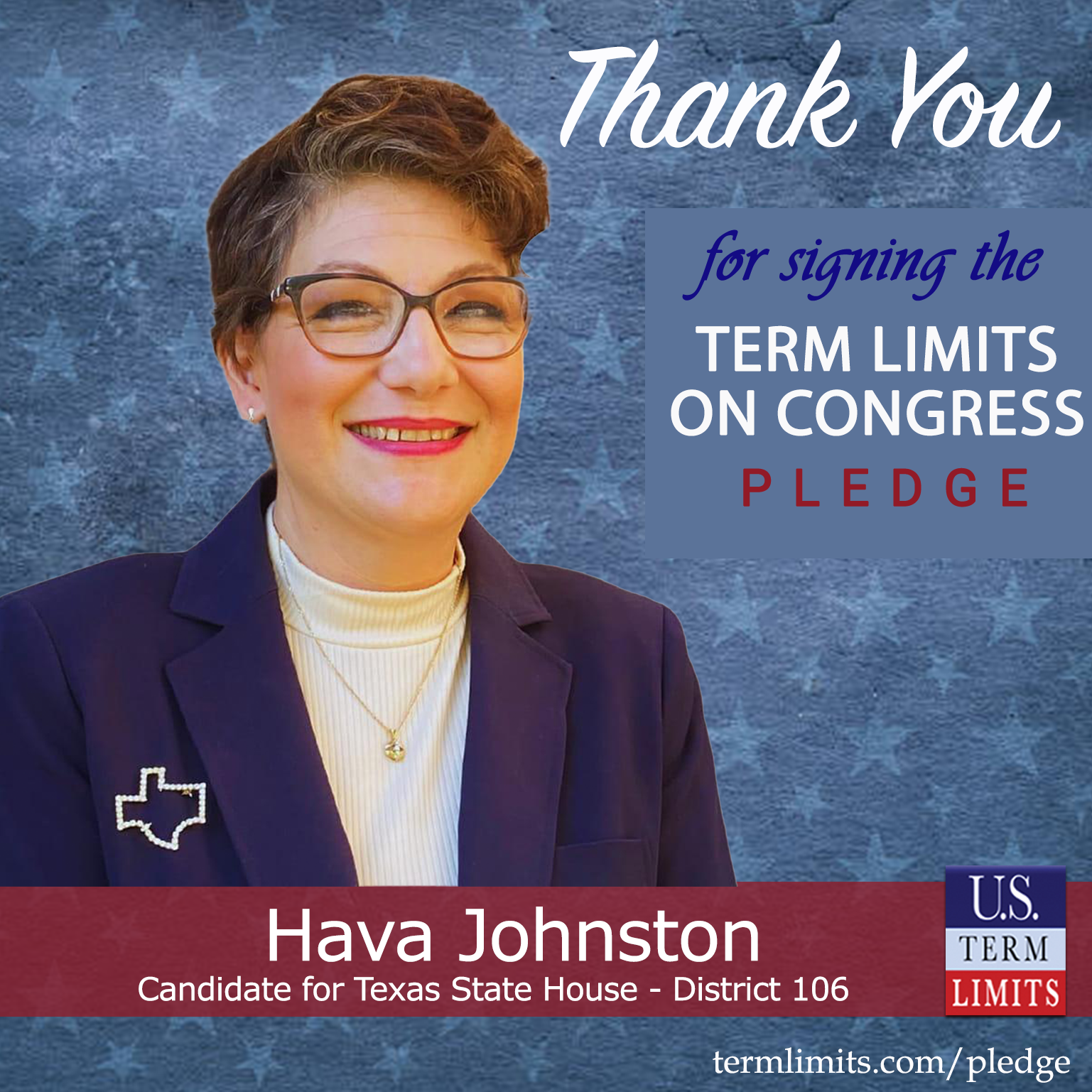 Frisco, TX – U.S. Term Limits (USTL), the leader in the national, non-partisan movement to limit terms for elected officials, is gathering support from state lawmakers across the nation. Its mission is to get 34 states to apply for an amendment proposal convention specific to term limits on Congress. Texas state house candidate, Hava Johnston (district 106), has committed support for term limits on Congress by signing the term limits convention pledge. Previously, incumbent Rep. Jared Patterson also signed the pledge.