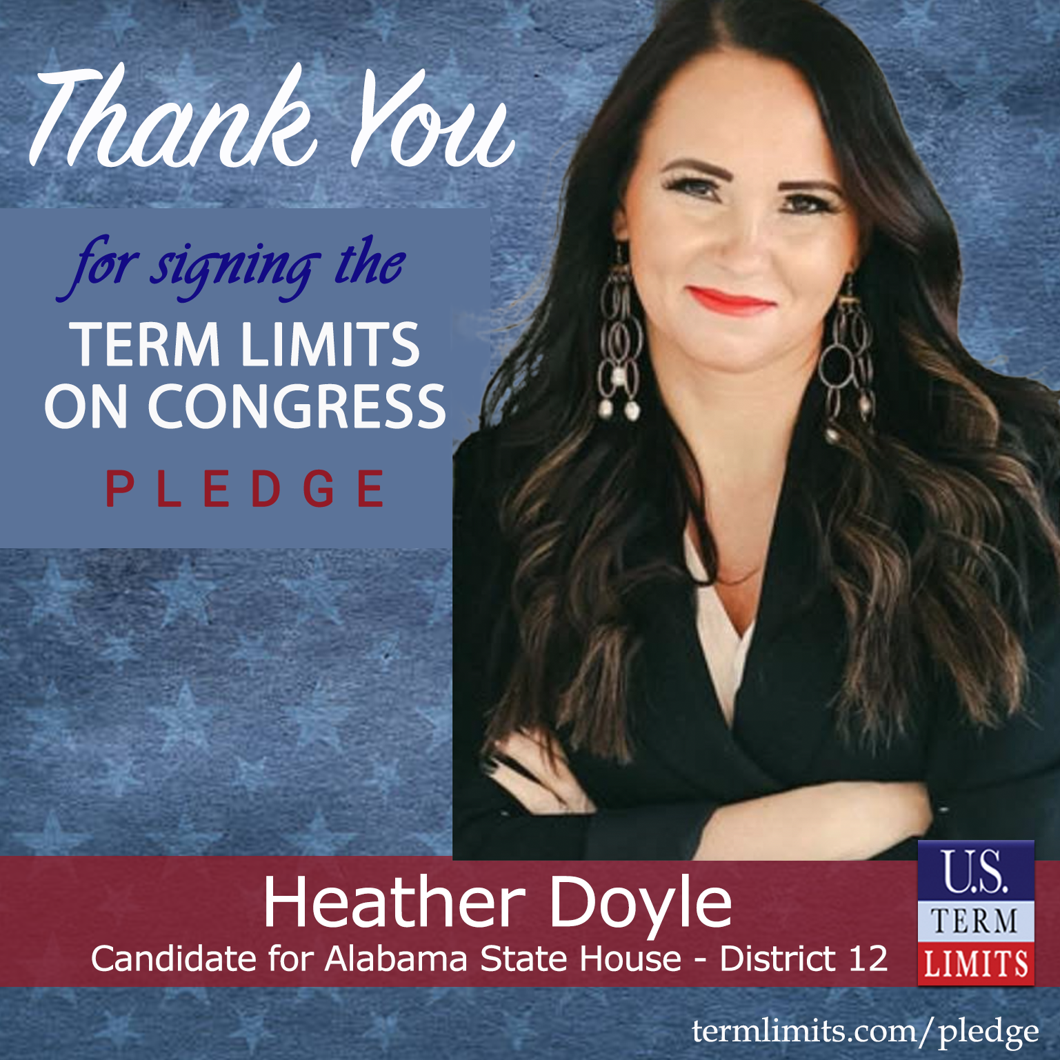 Cullman, AL – U.S. Term Limits (USTL), the leader in the national, non-partisan movement to limit terms for elected officials, is gathering support from state lawmakers across the nation. Its mission is to get 34 states to apply for an amendment proposal convention specific to term limits on Congress. 2025 Alabama state house candidate, Heather Doyle (district 12), has committed support for term limits on Congress by signing the term limits convention pledge. The special primary election is scheduled for July 15, 2025.