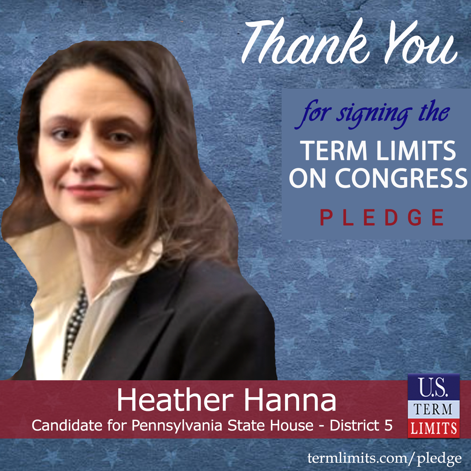 Reading, PA – U.S. Term Limits (USTL), the leader in the national, non-partisan movement to limit terms for elected officials, is gathering support from state lawmakers across the nation. Its mission is to get 34 states to apply for an amendment proposal convention specific to term limits on Congress. Pennsylvania state house candidate, Heather Hanna (District 5), has committed support for term limits on Congress by signing the Term Limits Convention Pledge. Hanna is the first signer in this race.