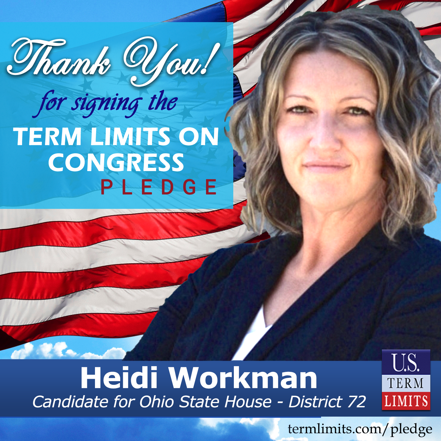 Columbus, OH – U.S. Term Limits (USTL), the leader in the national, non-partisan movement to limit terms for elected officials, is gathering support from state lawmakers across the nation. Its mission is to get 34 states to apply for an amendment proposal convention specific to term limits on Congress. Ohio state house candidate, Heidi Workman (District 72), has committed support for term limits on Congress by signing the term limits convention pledge. Workman is the first signer in this race.