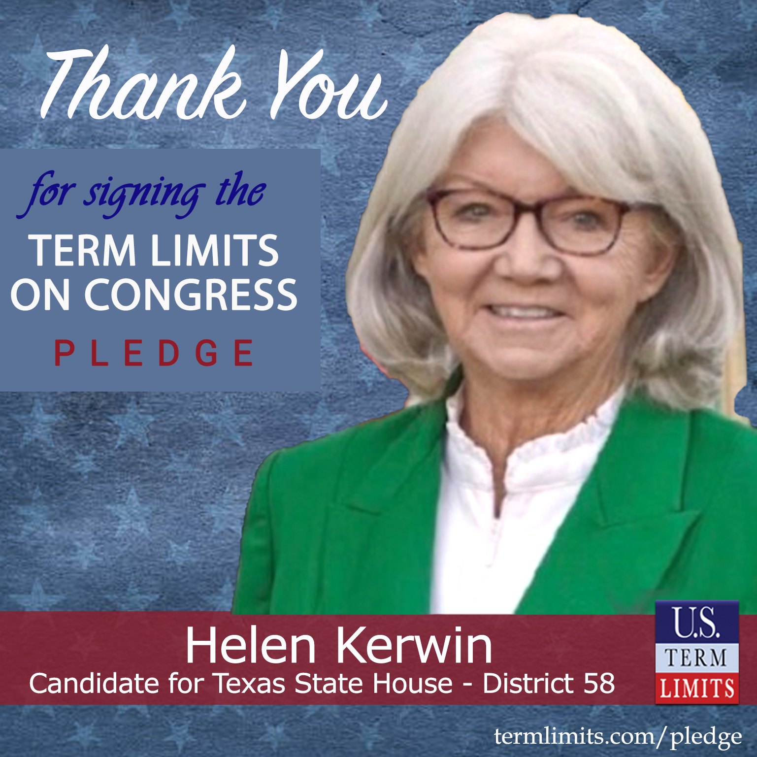 Cleburne, TX – U.S. Term Limits (USTL), the leader in the national, non-partisan movement to limit terms for elected officials, is gathering support from state lawmakers across the nation. Its mission is to get 34 states to apply for an amendment proposal convention specific to term limits on Congress. Texas state house candidate, Helen Kerwin (District 58), has committed support for term limits on Congress by signing the term limits convention pledge. Kerwin is the first signer in this race.