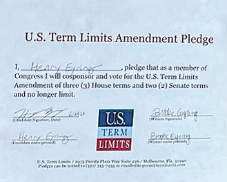 The U.S. Term Limits amendment pledge is provided to every announced candidate for federal office. It reads, “I pledge that as a member of Congress, I will cosponsor and vote for the U.S. Term Limits amendment of three (3) House terms and two (2) Senate terms and no longer limit.” The U.S. Term Limits constitutional amendment has been introduced in both the U.S. Senate by Senator Ted Cruz and his colleagues (SJR2) and the U.S. House by Representative Ralph Norman (HJR11).