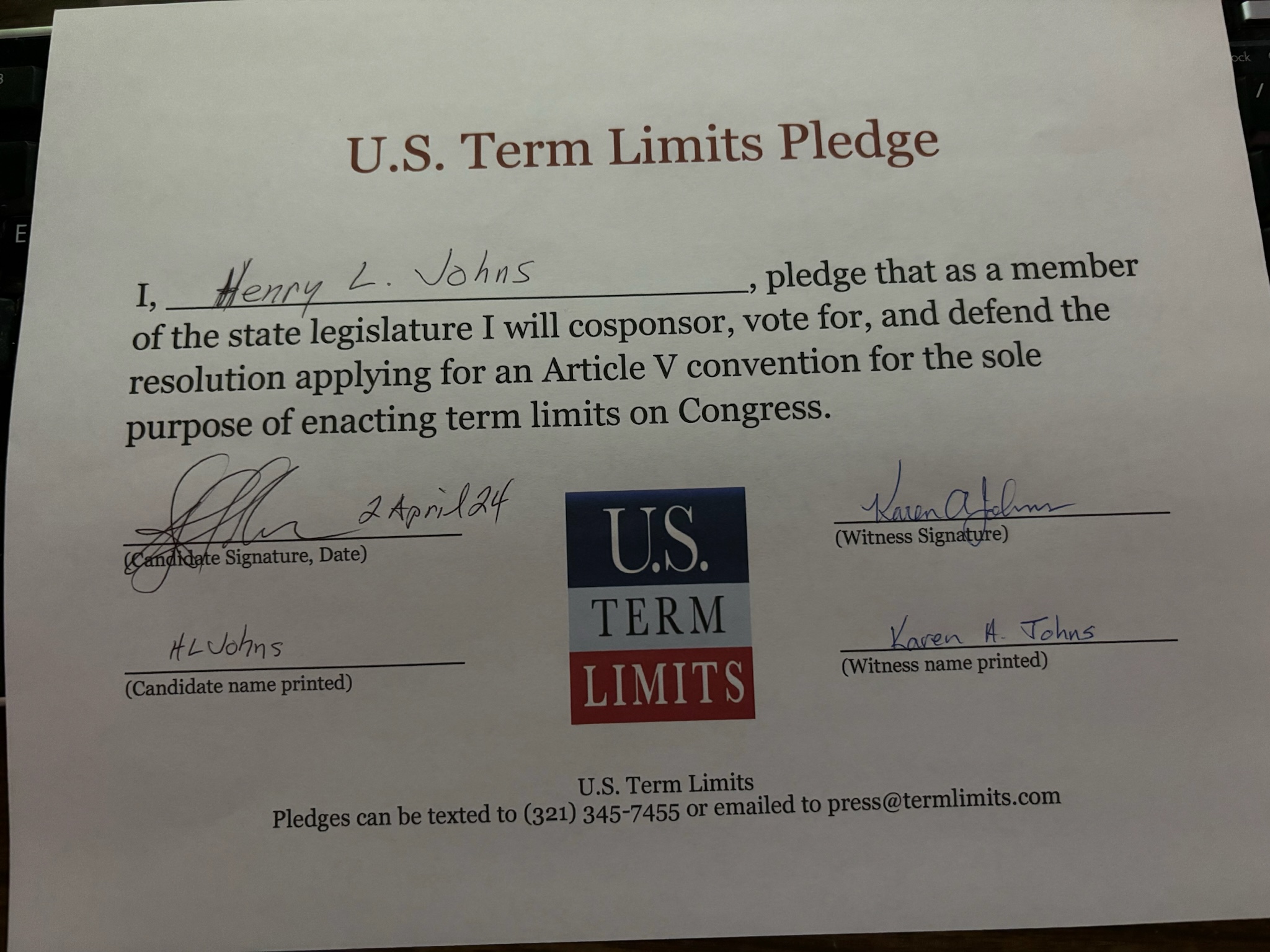 USTL President, Philip Blumel, commented on Johns’s pledge saying, “Henry’s strong support of term limits shows that there are individuals who are willing to listen to the majority of voters who want term limits. America needs a Congress that will be served by citizen legislators, not career politicians.”