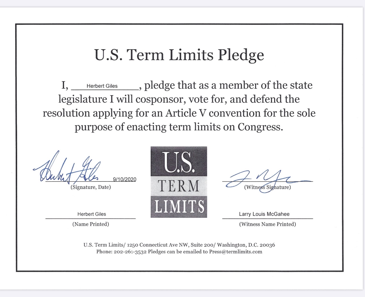 Washington, D.C. – U.S. Term Limits (USTL), the leader in the national, non-partisan movement to limit terms for elected officials, is gathering support from state lawmakers across the nation. Its mission is to get 34 states to apply for an amendment proposal convention specific to term limits on Congress. 2020 Georgia state house candidate, Herbert Giles (district 69), has committed support for term limits on Congress by signing the Term Limits Convention pledge.